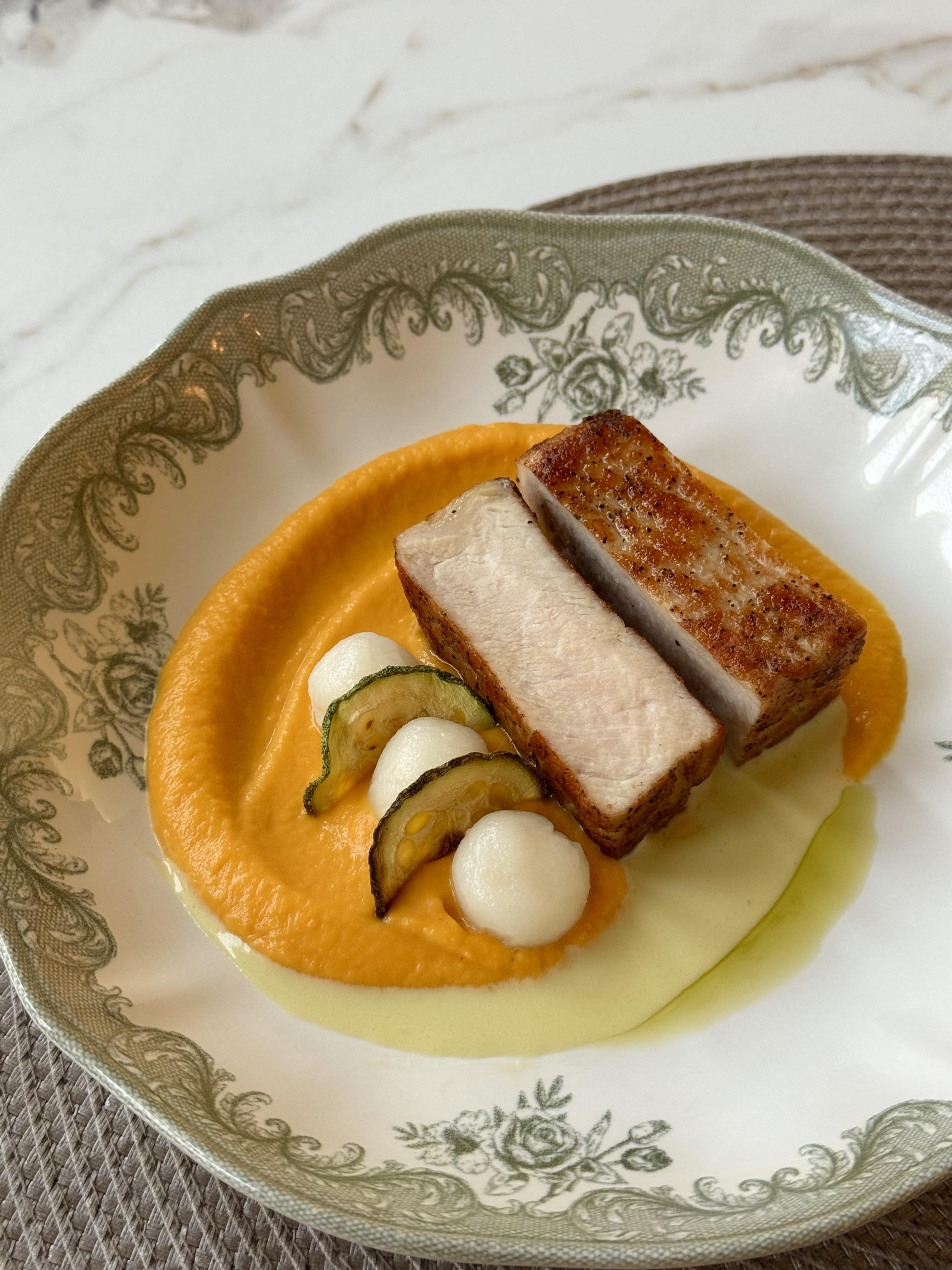 I blended the puree for a bit longer this time, with a splash of whipped cream and a bit of butter. Defo smoother and ugh so good. Reused the dehydrated squash chips I had before, don’t have more atm to experiment with shapes 😅 tbh i feel like a dollop of caviar would really help this dish. Maybe next time.