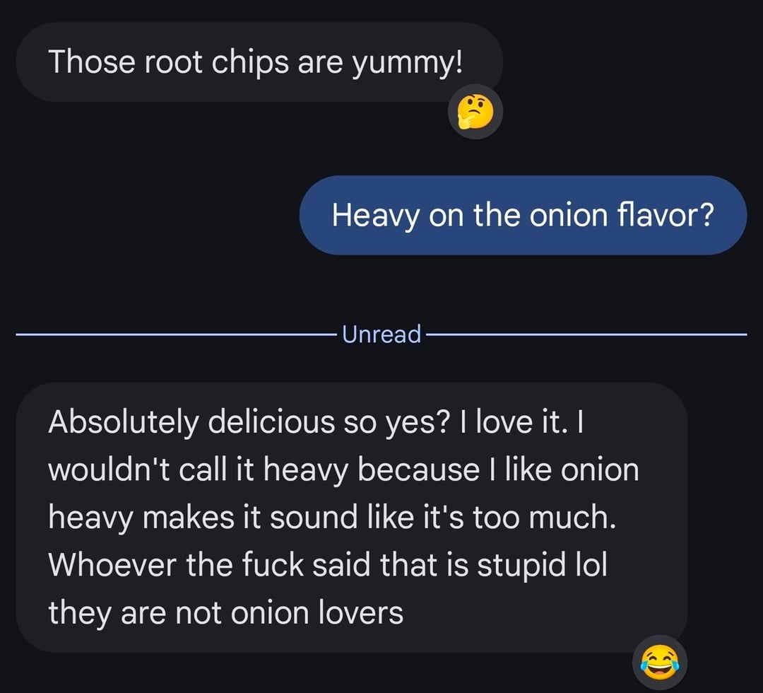 Told her somebody on this sub said they thought they were too heavy on the onions (it was a passing comment on a post talking about them). She gasped before whispering quietly "how are they a lover of onions? Any onion flavor is a good flavor, even if it's only onion…" She's great at theatrics—the shopper next to us thought I had made her cry she pulled such a convincing face 🤣