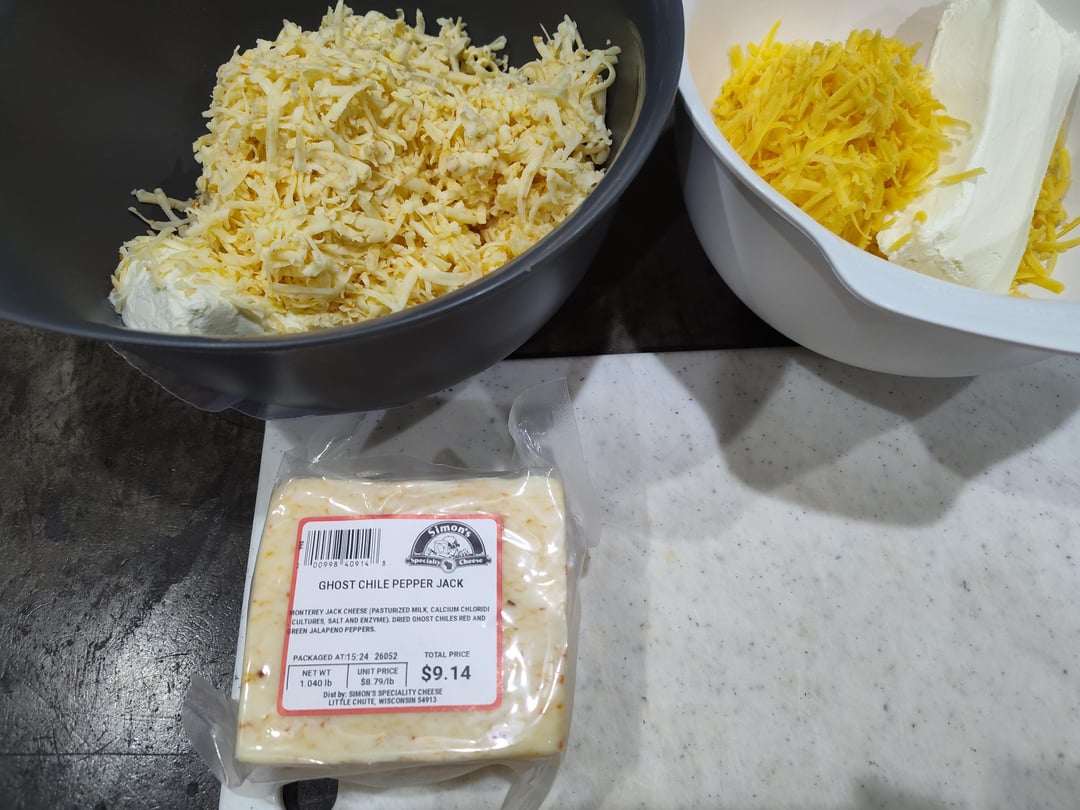 One bowl 8oz cheddar to 8 oz cream cheese, other bowl 16oz ghost jack to 8 oz cream cheese.