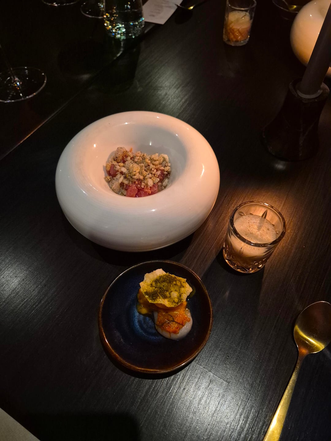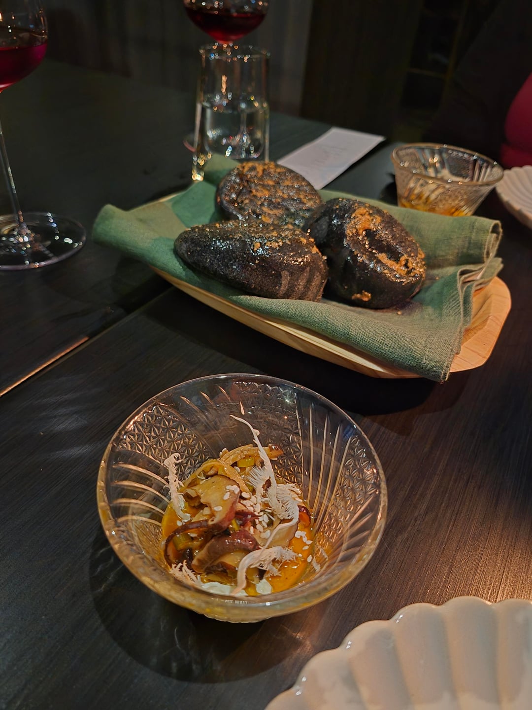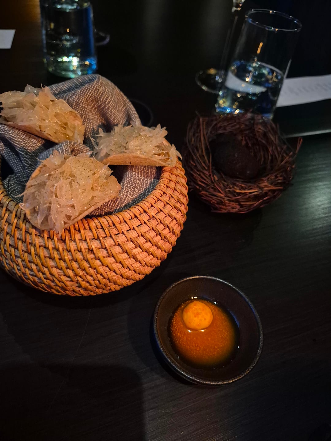 The next course was 3 snacks. The first of which was a taro chip topped with curry, pomelo, and seaweed – the curry shined through on this. The other two dishes were a soft boiled quail egg coated with what I believe may have been charcoal and a sauce made from quail egg yolk – absolutely delicious.