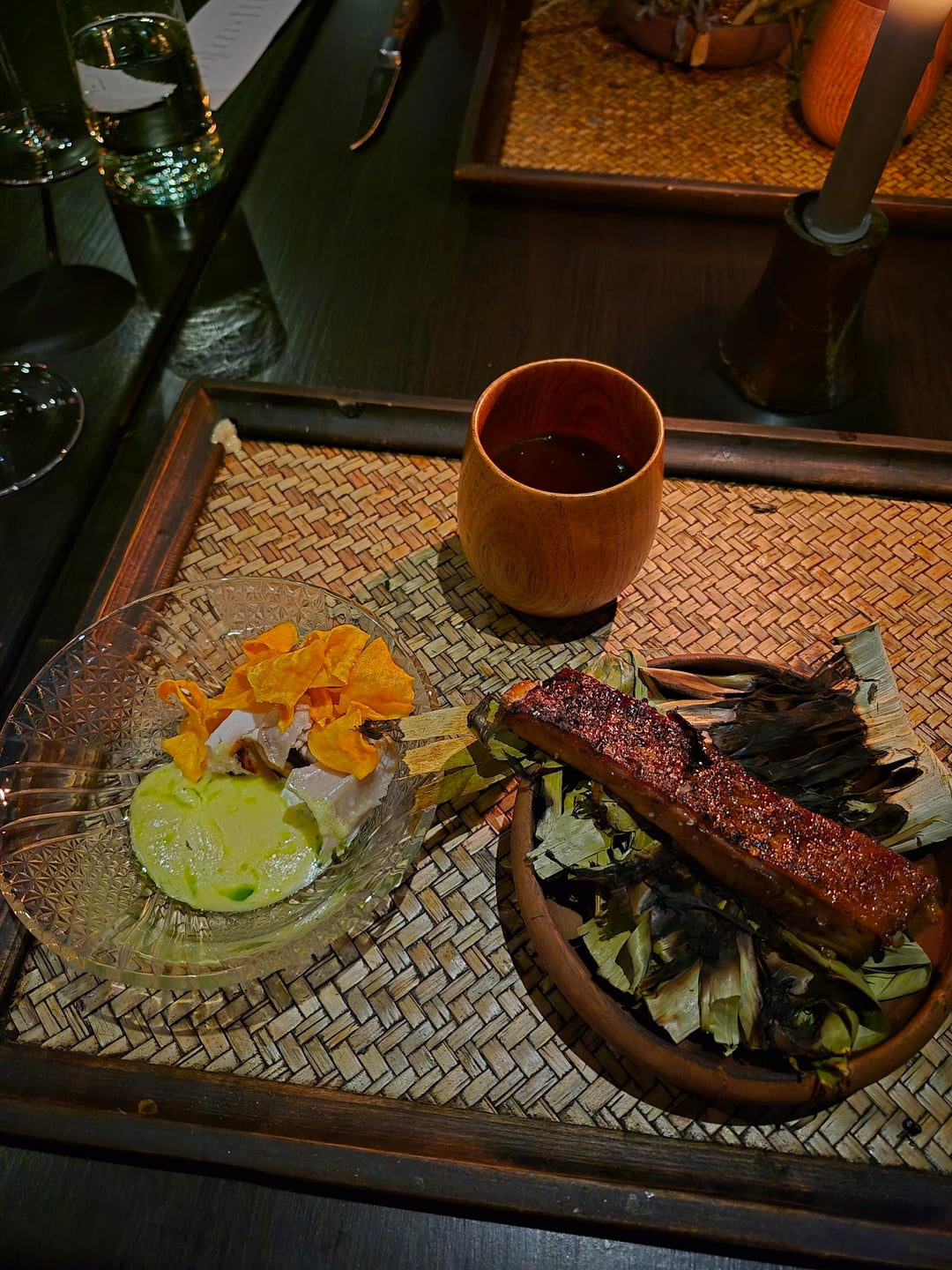The final course of the night was a selection of desserts served in a woven basket. In order from left to right they were: Pavlova, coconut/coffee/dark chocolate, donuts in banana ice cream, meringue with coconut filling, and finally a pandan and coconut gummy.