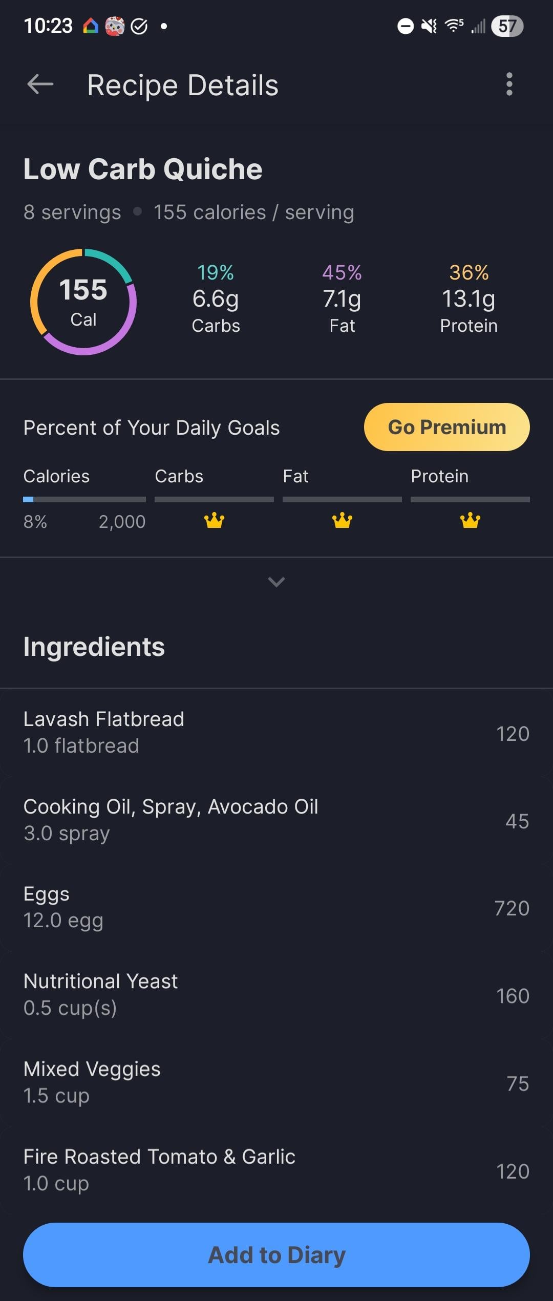 Attached is what my breakfast looked like and my macros were perfect when I had two slices of the quiche along with my normal oats and soy milk. My highest calorie meal is always breakfast, then I have a light snacky-ish lunch and a medium-ish dinner and I'm still in a deficit by the end of the day and my stomach is empty by bed time, which is what you want for optimal digestion.