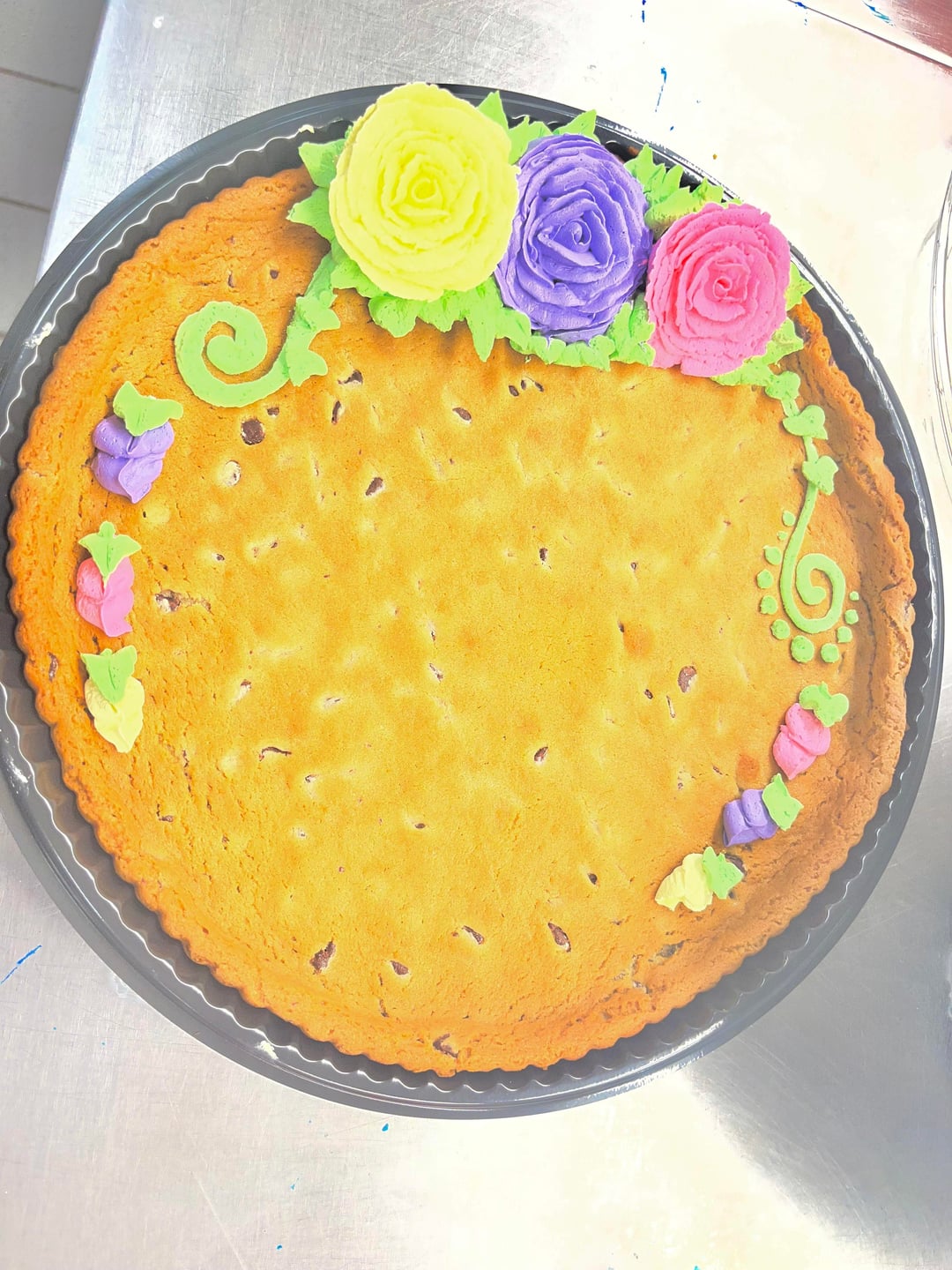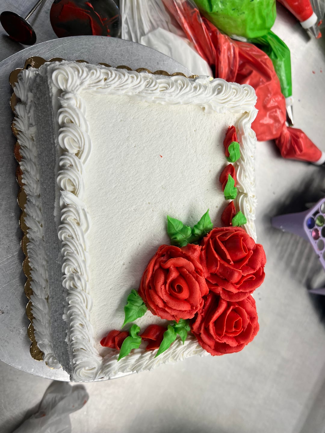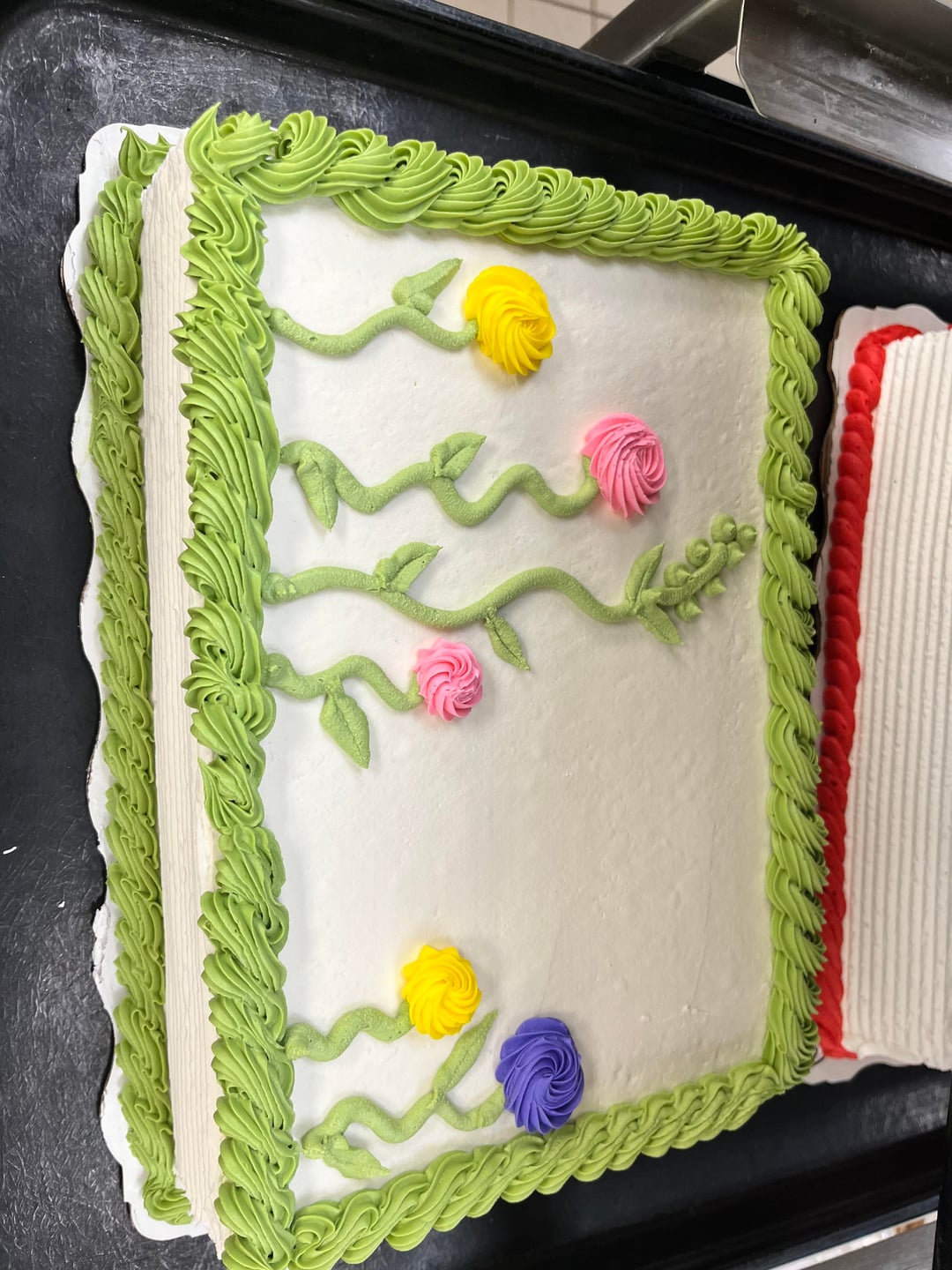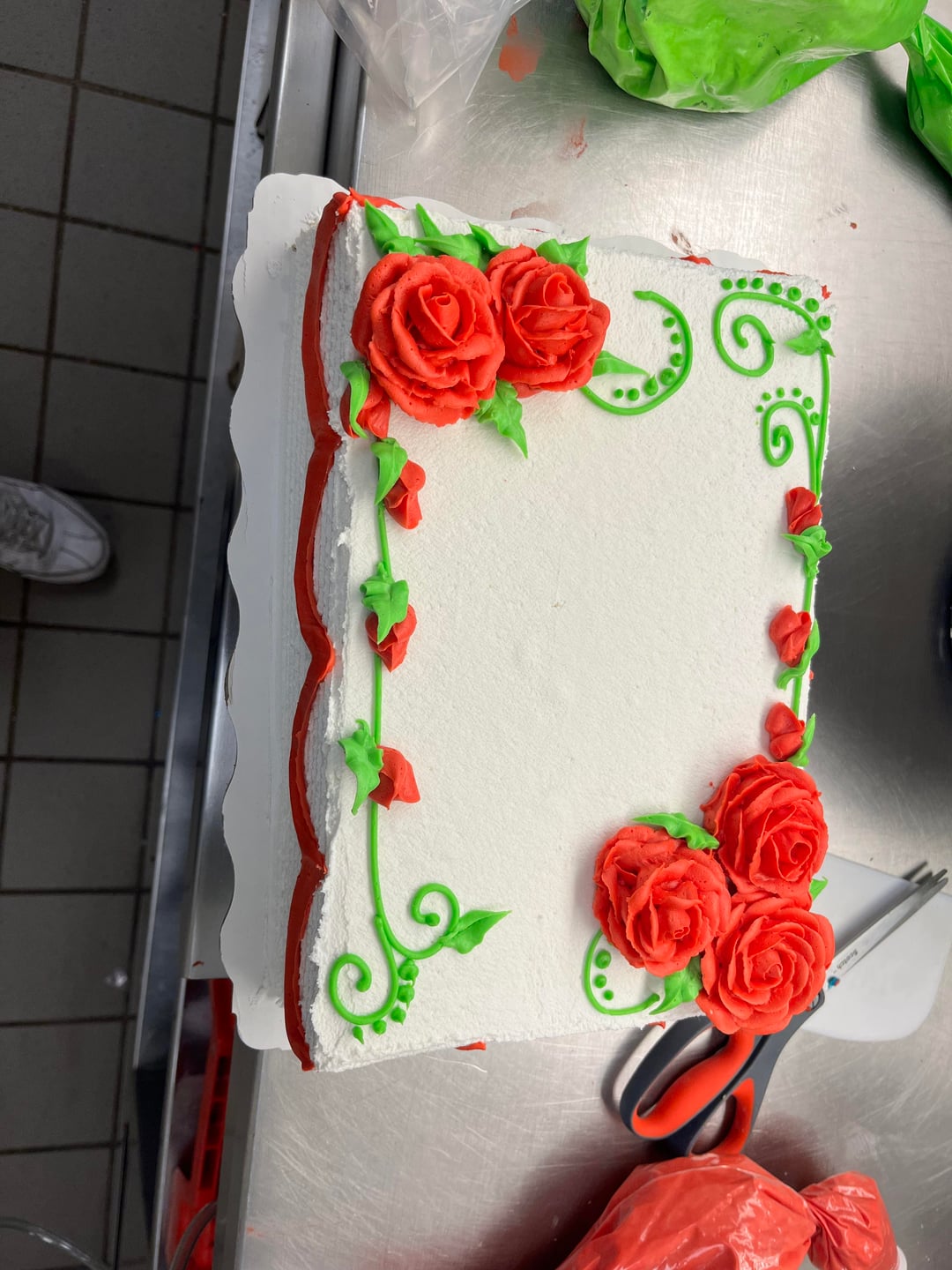 For a beginner you truly are a natural and should be proud! I love your flowers and, for some reason, your green garden cake. I’m sure your creativity is a bit stifled there, but you’ll get skills under your belt and maybe move on to professionally decorate in a bakery where you will have more freedom. As far as suggestions, I would look to your edging piping – it can get a little wonky sometimes and you want to make sure it’s even and regular. And, in picture 9, the piping at the base of the cake looks like you went one direction then the other, giving it motion, like a rough sea, unless that was the intention. But, like I said, you’re really good, keep up the great work! 😻