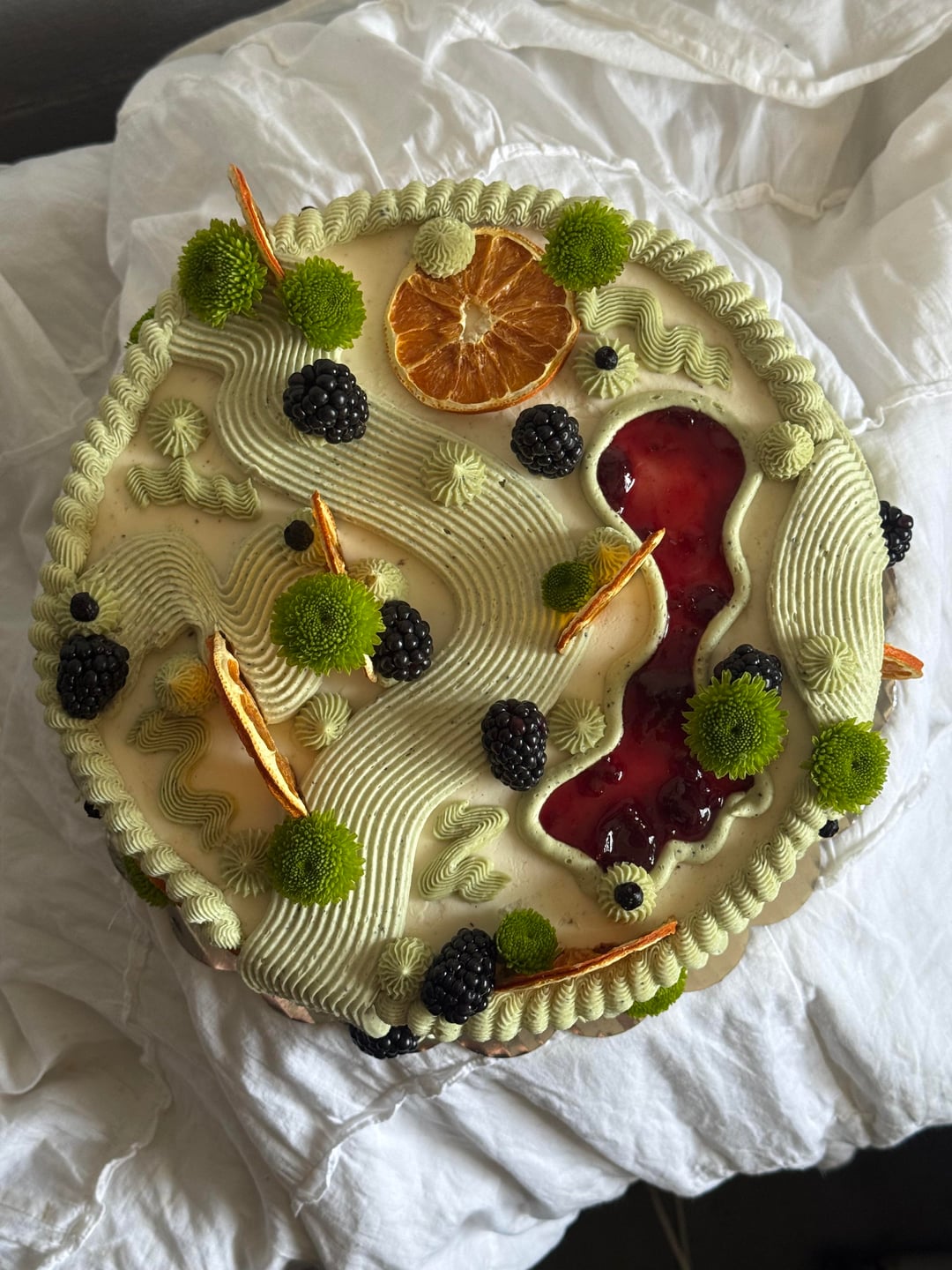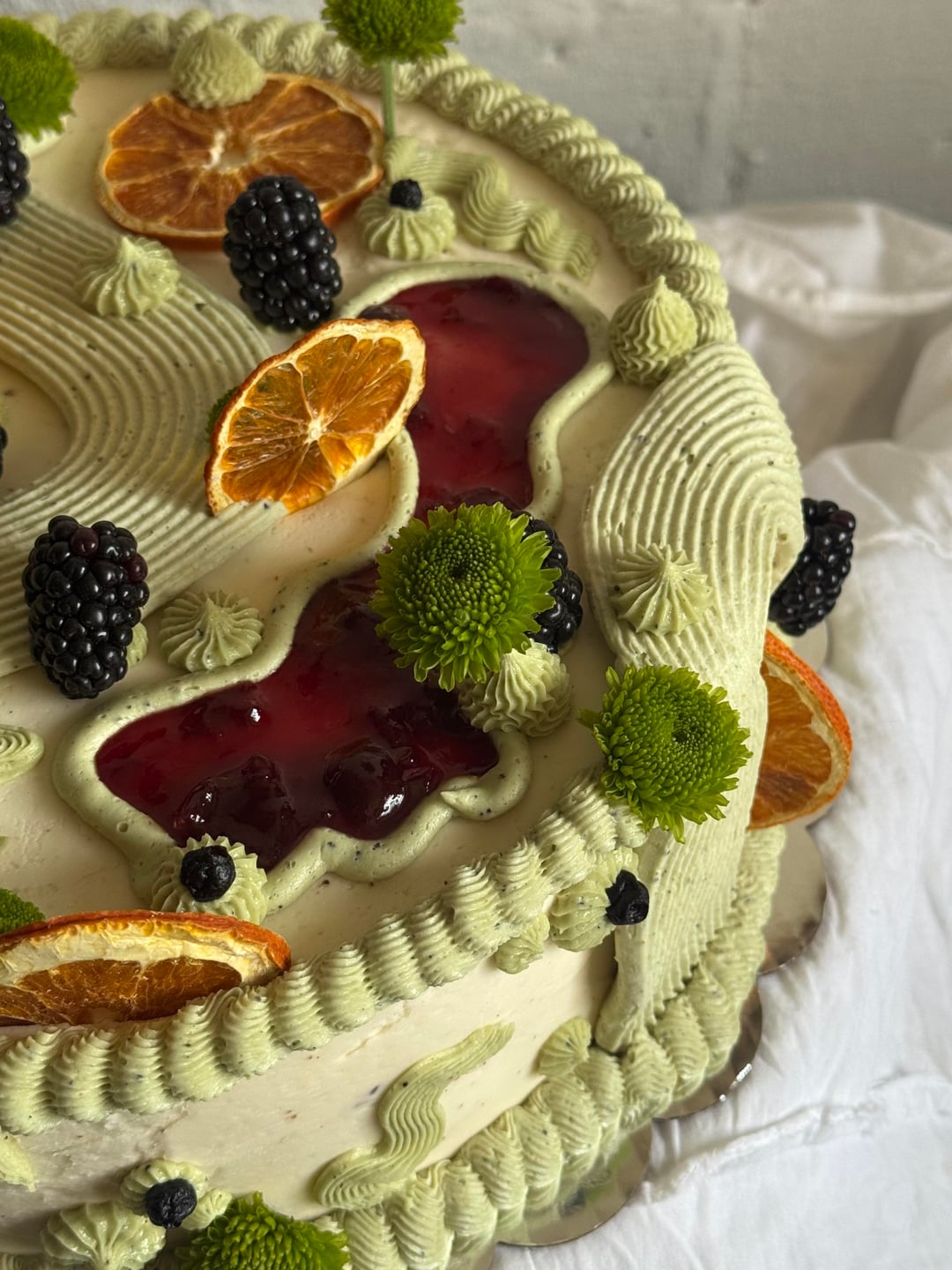Chocolate cake, cinnamon soak, cherry preserves, dark chocolate ganache, black sesame frosting on the inside, green buttercream is colored with matcha, butterfly pea, and turmeric.