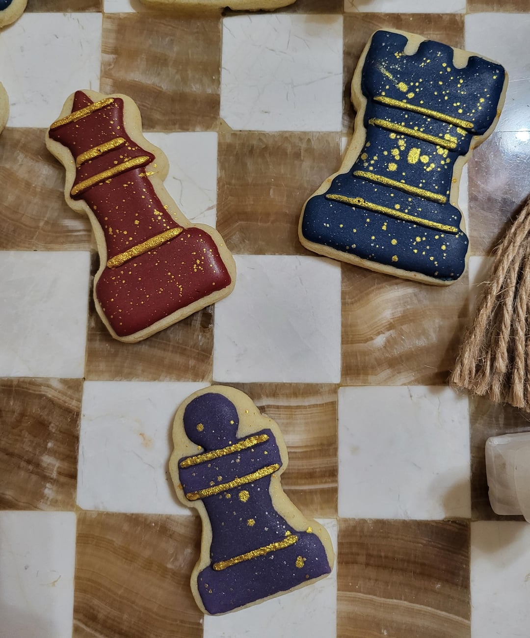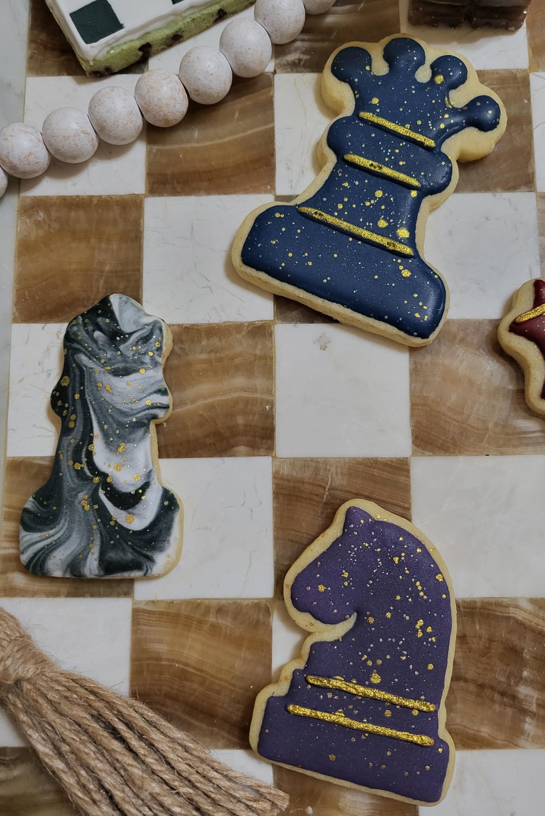 My grandson loves playing chess and turns 11 Monday. He requested chess cookies in "royal" colors. They went WAAAYYY darker than I thought and it was my first time dipping for the marble-effect and painting gold luster dust, but hopefully he will like them. This is only my 2nd set of cookies so I still have a lot to learn. 😊