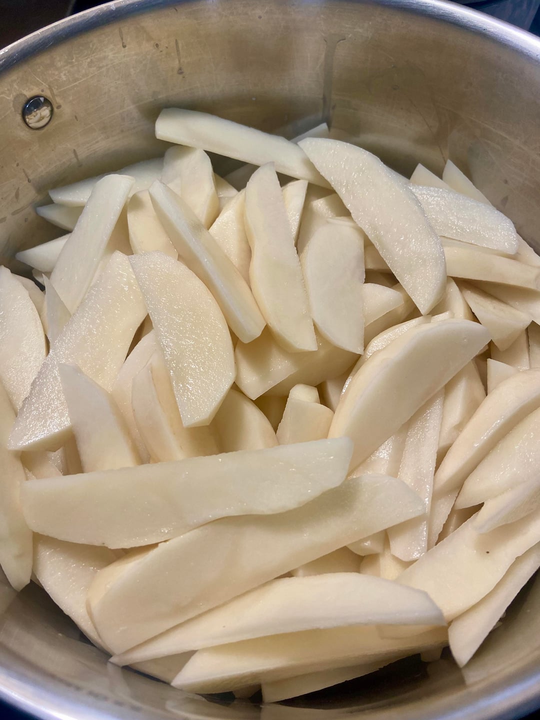 I was already using some of the potatoes to make mashed potatoes for that nights dinner. So I processed all the peeling and cutting at the same time. It was my day off so I peeled and cut everything and placed the dinner potatoes in a bowl of water until I was ready to make dinner.