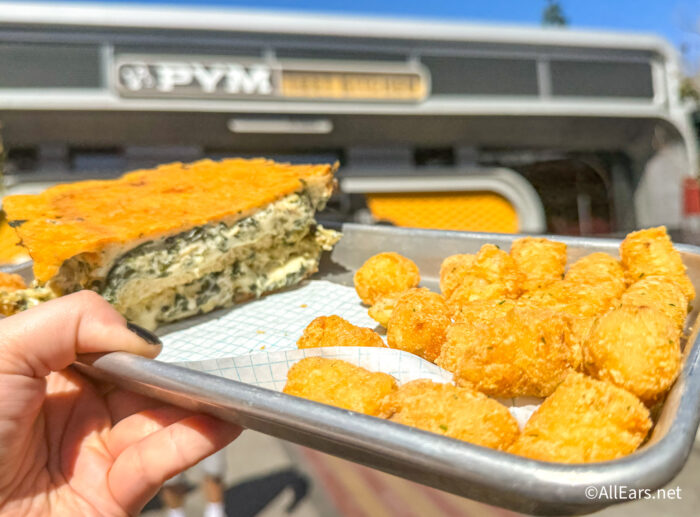 The bread here is parmesan crusted, so it’s perfectly crispy, and we loved the garlic salt on the tater tots as well. This is heavy though, so don’t get on any wild rides after!
