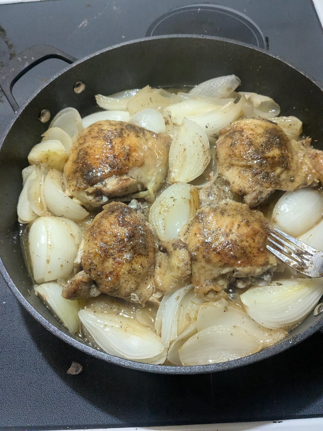 I do almost the same thing but add mushrooms and usually I’ll debone the thighs.