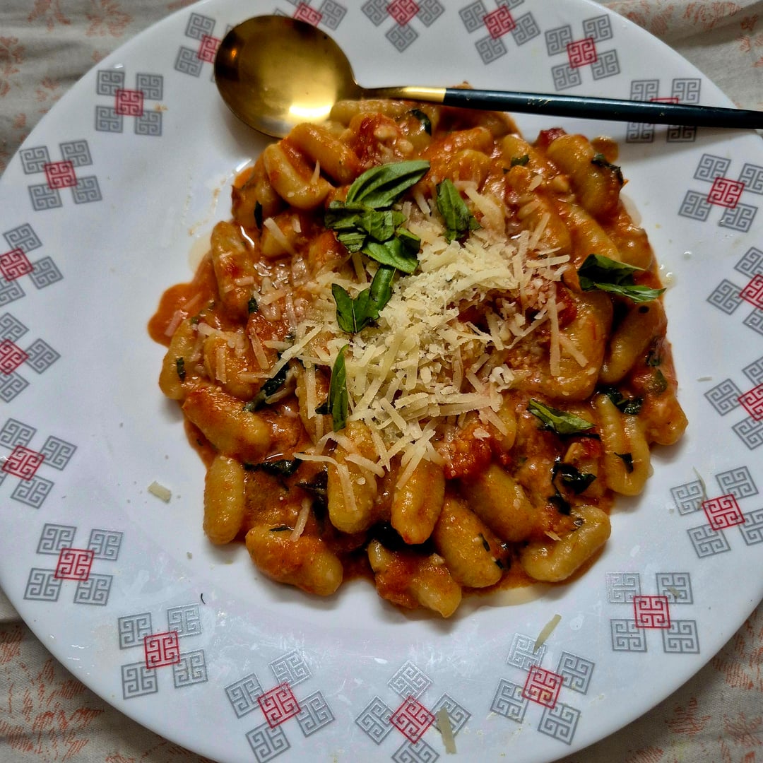 Still very happy with how this came out, despite overloading the tomato sauce with too much parmesan. (Cooking the tomato in halves so I can easier fish out the skins.)