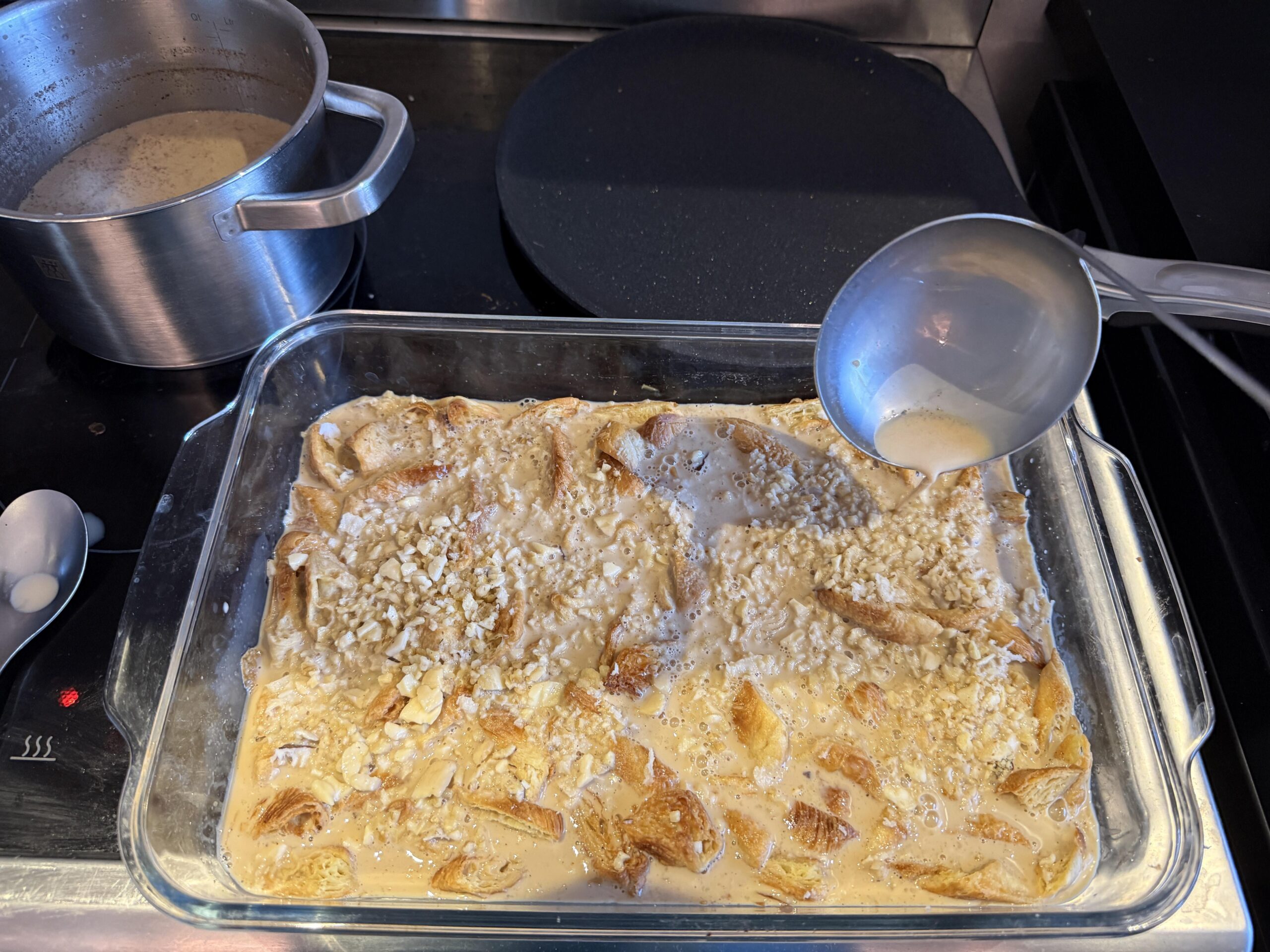 Umm ali is an Arabic bread pudding. I used this recipe with Oatly barista and vegan croissants, but you can use day old white or pita bread too. https://veganbilaraby.com/umm-ali-recipe/. Oh right, I added golden sultanas since I like them in this dish.