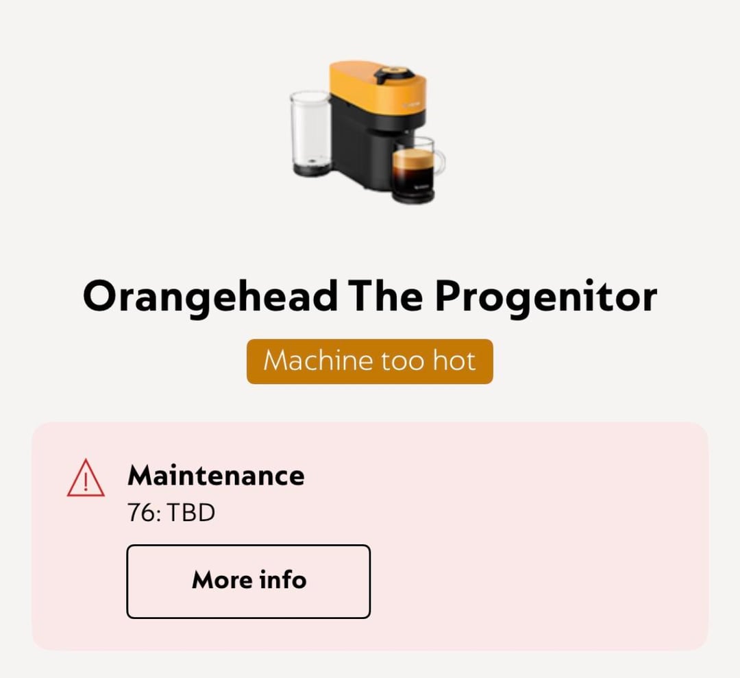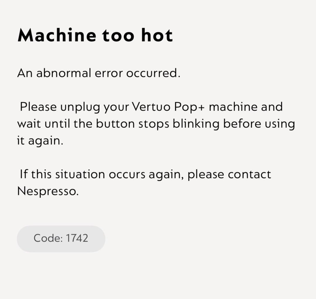 Hi! So my Nespresso Vertuo Pop has been my trusty companion for the past year and a half now. A couple weeks ago, the light flashed orange and I descaled the machine for the first time (I know, I know, I should’ve done it sooner). I was having a lot of trouble getting it to stay connected to the app, so I updated the firmware. Finally was able to descale it with all the proper fluids from Nespresso, and it worked for about two days before it just kinda stopped. It doesn’t make any sounds, just flashes white for a long time like it’s heating up, then does the double red pulse. I called Nespresso and was able to get on a video call with tech support, and after 20 minutes of trying and failing to get this thing to work, I was told it was going through a “remote software update” and it would take 24-48 hours. 80 hours later, it’s still not working. The app is also telling me the machine is getting “too hot” even though it’s not doing anything, and that the software is perfectly up to date. Has anyone else had this problem??? I’m this close to demanding a new machine, regardless if it’s past warranty.