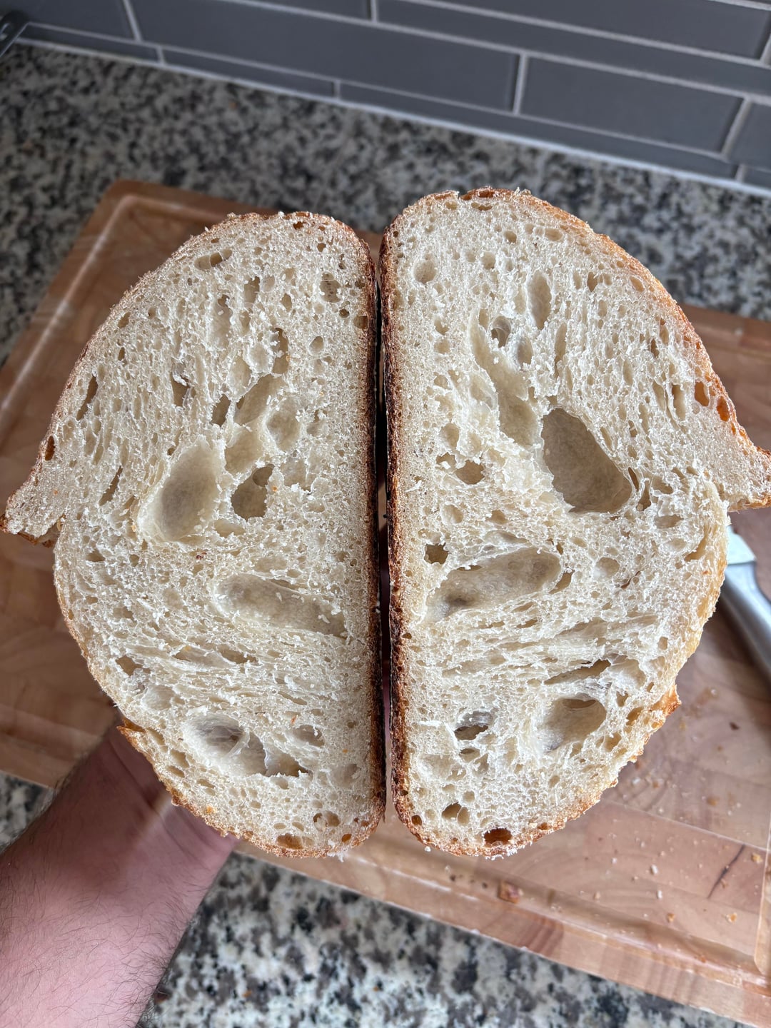 Nice work, will keep getting better from here! It looks slightly underproofed and like it could use more time in bulk. Be aware the extra salt slows fermentation so make sure to ferment longer whenever that happens