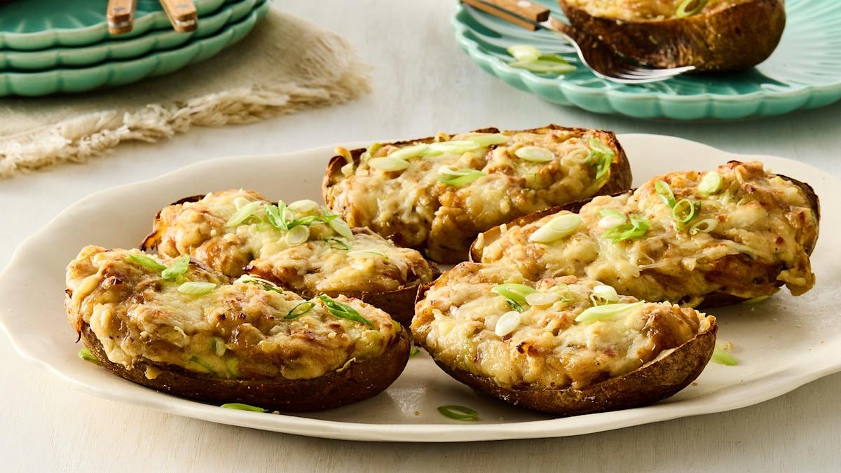 Spoon the filling into the potato skins, sprinkle with the remaining ½ cup cheddar and bake until heated through, 10 to 15 minutes. Turn the oven to broil and broil until the cheese is browned and bubbling, 3 to 4 minutes. Sprinkle with the remaining 2 green onions before serving.