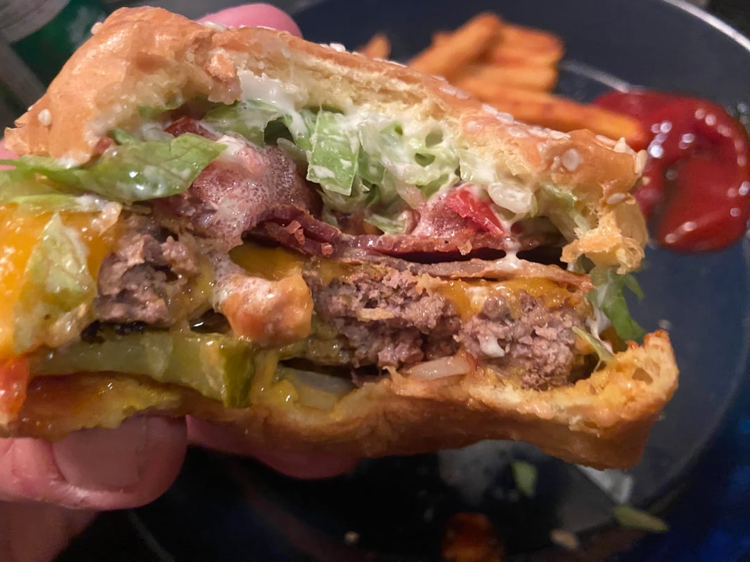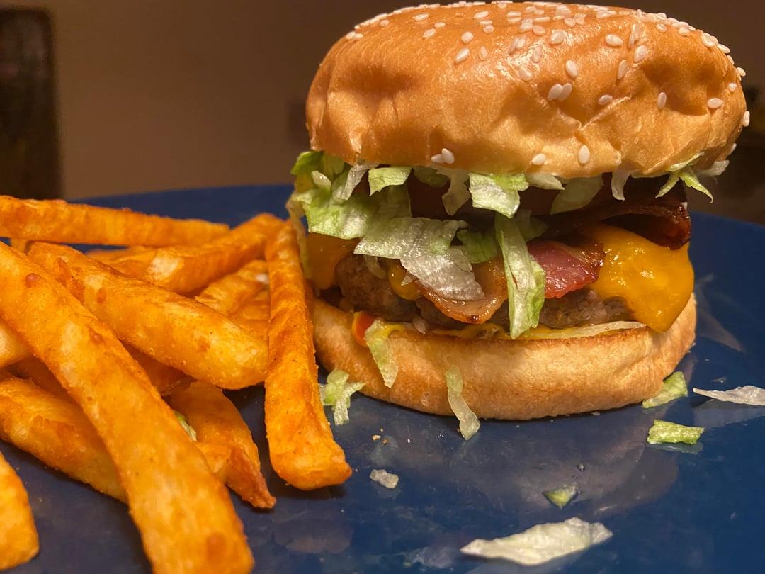 1/4 pound patty, bacon, old cheddar, lettuce, tomato, onion, dill pickle, ketchup, mustard and mayonnaise on a sesame seed bun with fries. 🤌 by Kissa4ever Dining and Cooking