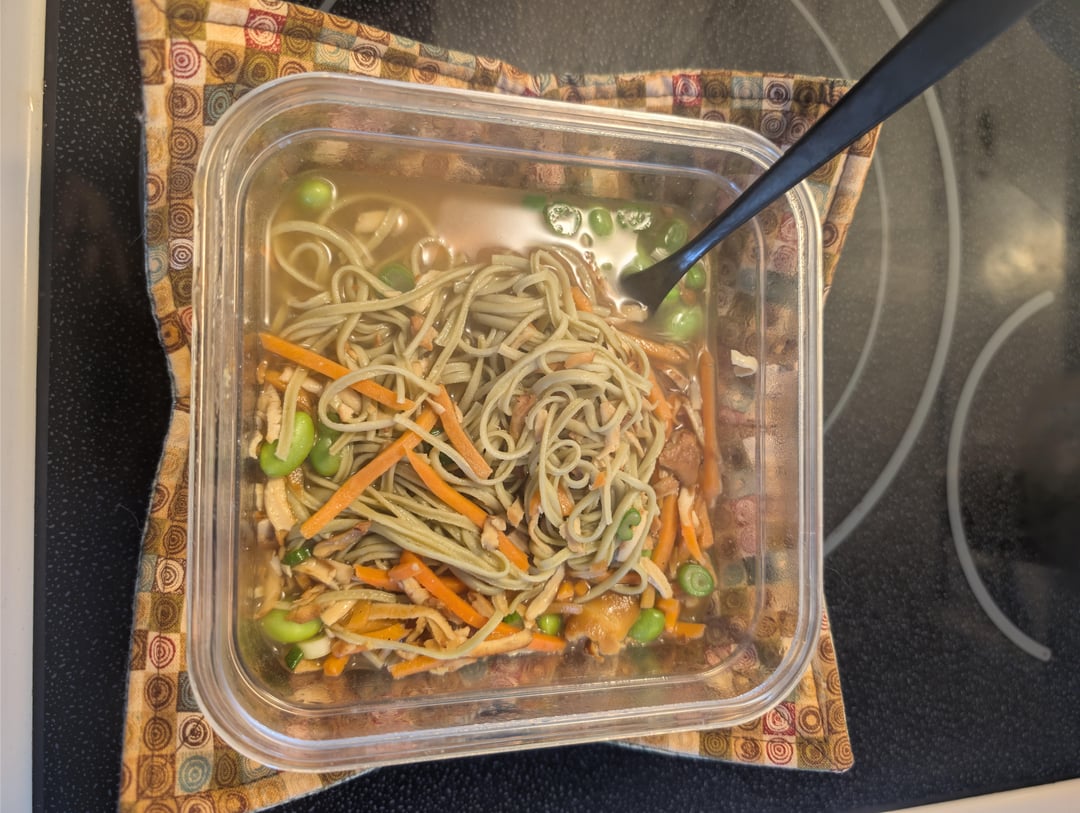 My first post but I thought this turned out pretty good. Easy meal prep kept all the solid ingredients in a container and then add heated broth when ready to eat. Fry shredded smoked tofu in 1 tbs of oil, soy sauce and generous amount of black pepper, cook spaghetti to package instructions then rinsed in cold water if meal prepping. Also added 1 tbs of soy sauce to broth but add to your preference.