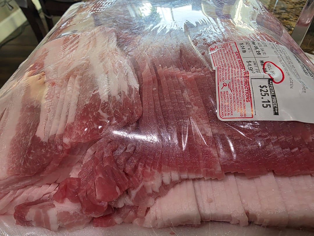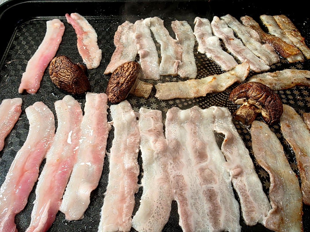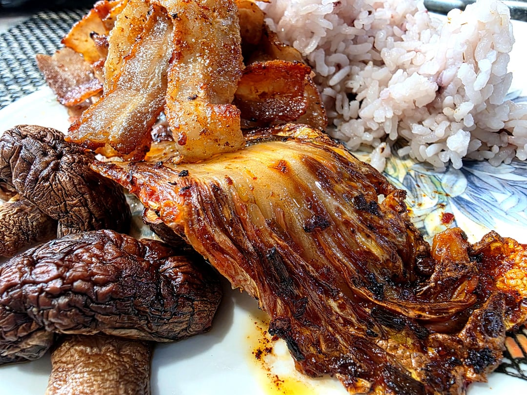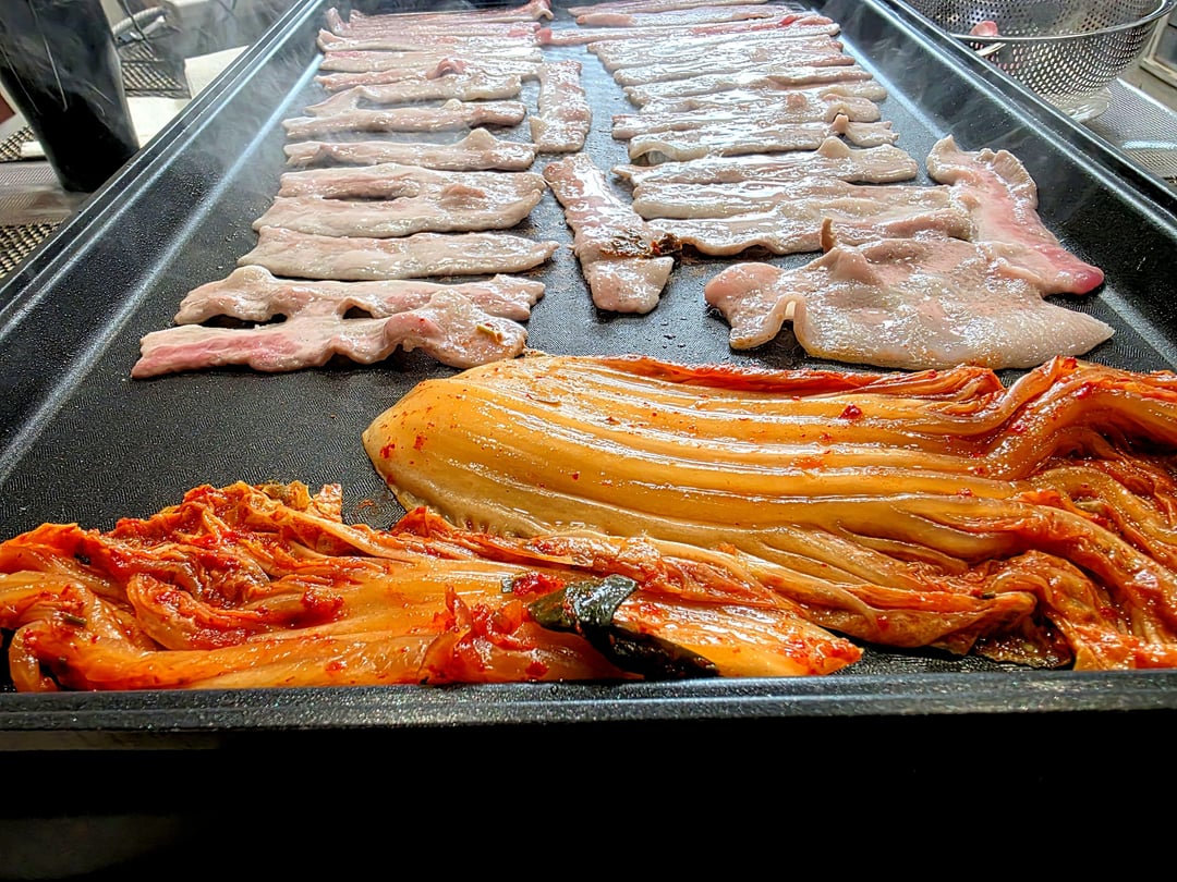 Pork belly, mushrooms, and kimchi on the tabletop.
