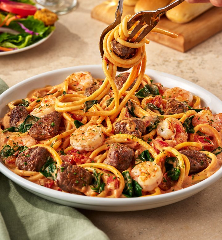 When’s the last time you went to Olive Garden? If all you remember are bottomless breadsticks, soup and salad, you’re due for a visit. In addition to the Italian chain resto’s epic appetizer selection (don’t sleep on the stuffed ziti fritta), they’re continually adding new menu items to the lineup that are well worth ordering. Case in point: the Calabrian steak and shrimp bucatini, which just launched on July 7.