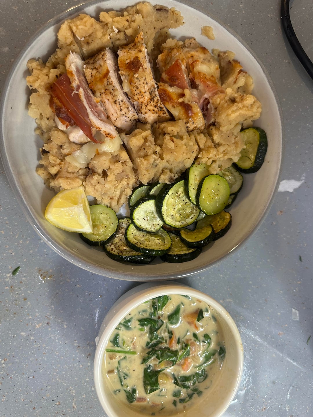 7.5/10 This was so good! I lowkey burnt the mashed potatoes. The chicken was so good with the cheese and prosciutto. I loved the sauce too! Thought it was kinda random to have raw ish tomatoes in it but still tasty. I overcooked the zucchini so ignore that lol