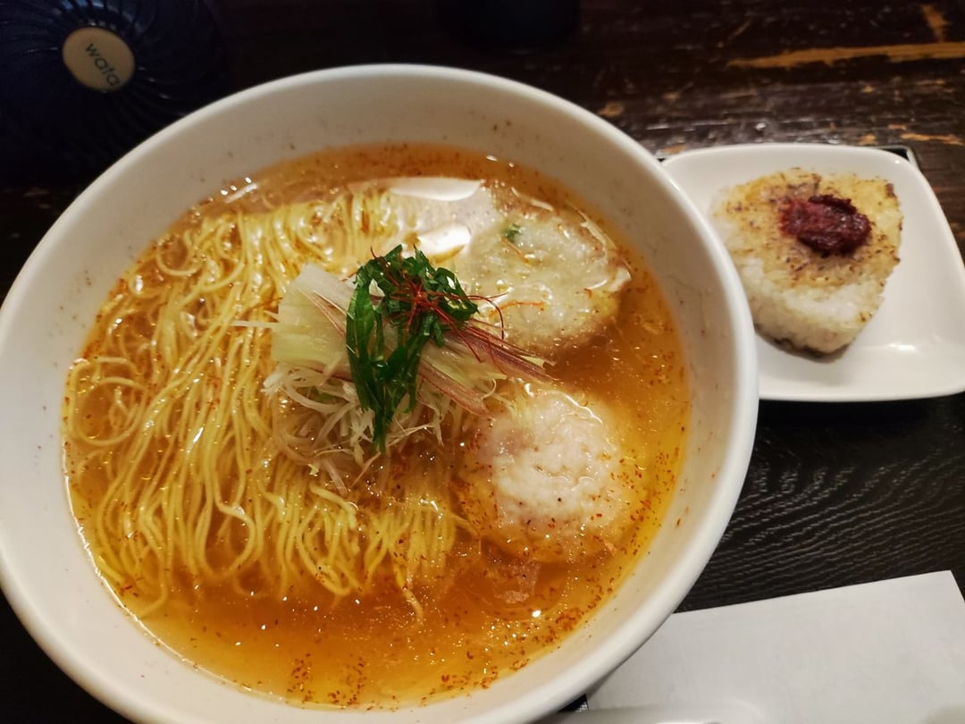 Fish shio ramen, chicken meatballs (shrimp also available), and grilled rice ball with mackerel at Menya Kaijin in Shinjuku, just a short walk near JR Shinjuku Station's southeast exit.