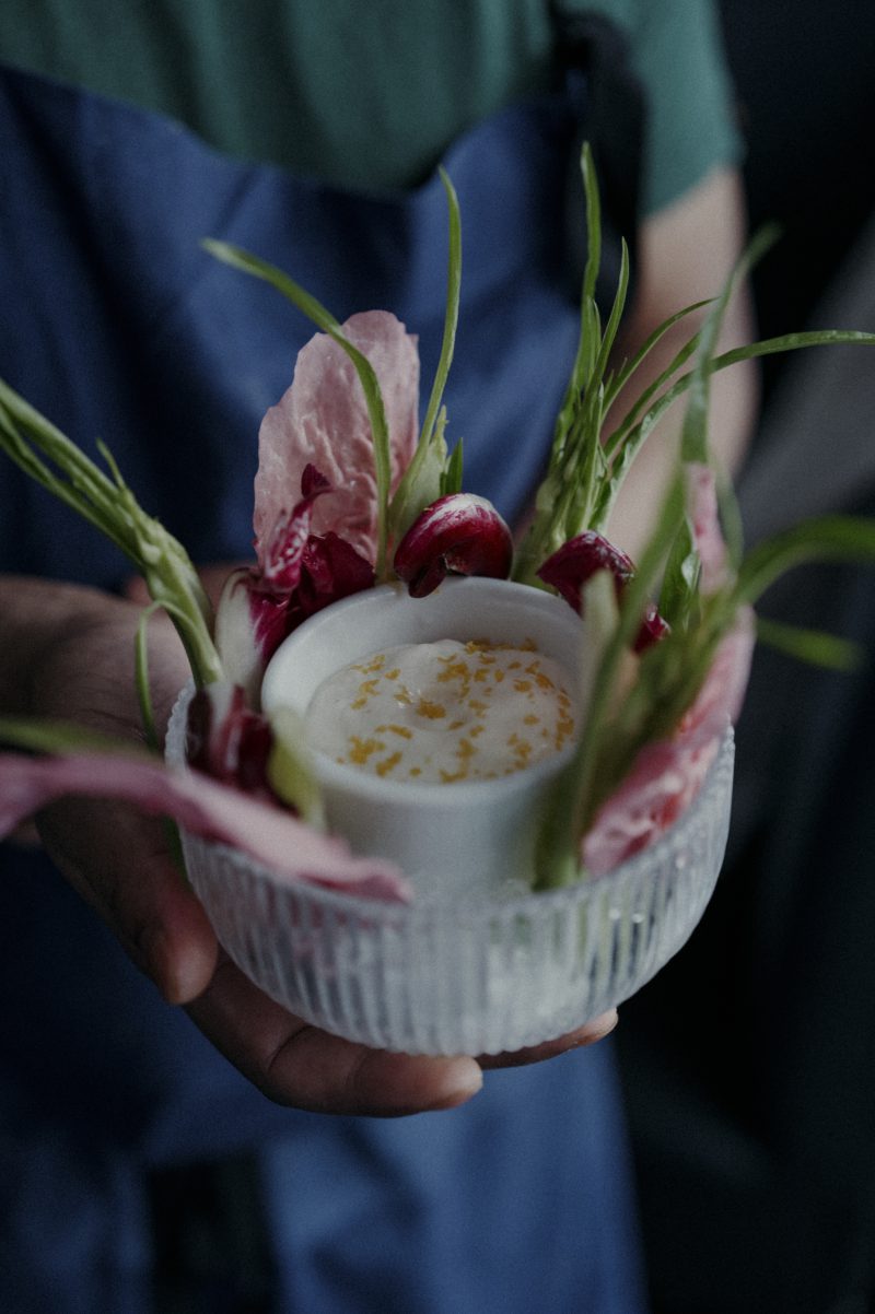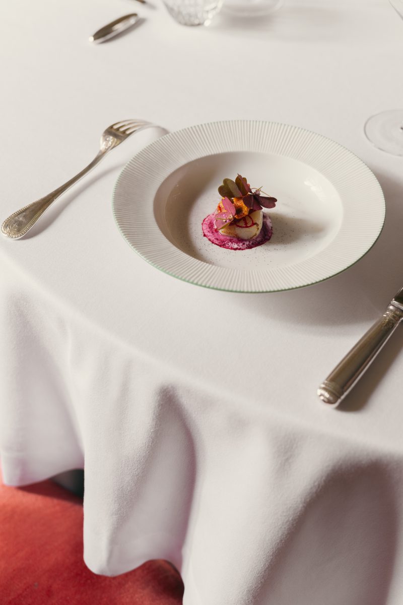 And yet the chef is Andrea Capasso, Italian by formation, shaped at ALMA and then slowly, deliberately, within these very walls. His cooking does not announce its origins. It reveals them — in texture, in balance, in the way a plate is composed the way a sentence is: each element placed where it earns its place. Classical French technique is neither the point of arrival nor a thing to be argued with. It is simply where he begins.
