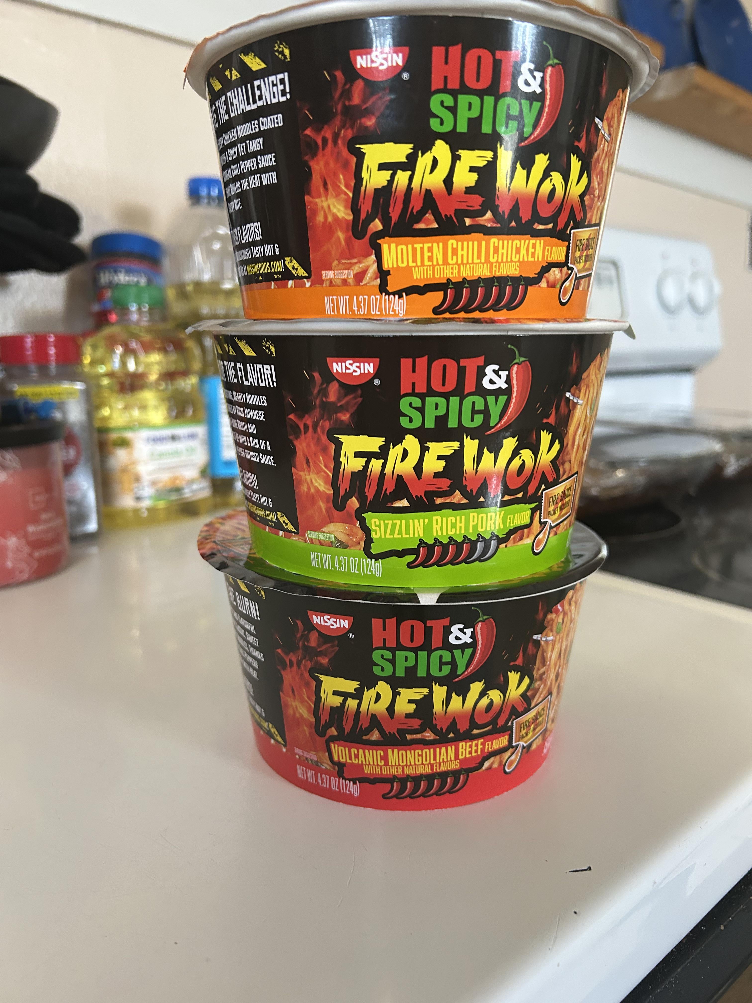 They are all good, but I like the “Sizzlin’ Rich Pork” flavor the best. They have a seperate “Fire Sauce” packet so I would sometimes save those if I wanted it to be a little less spicy