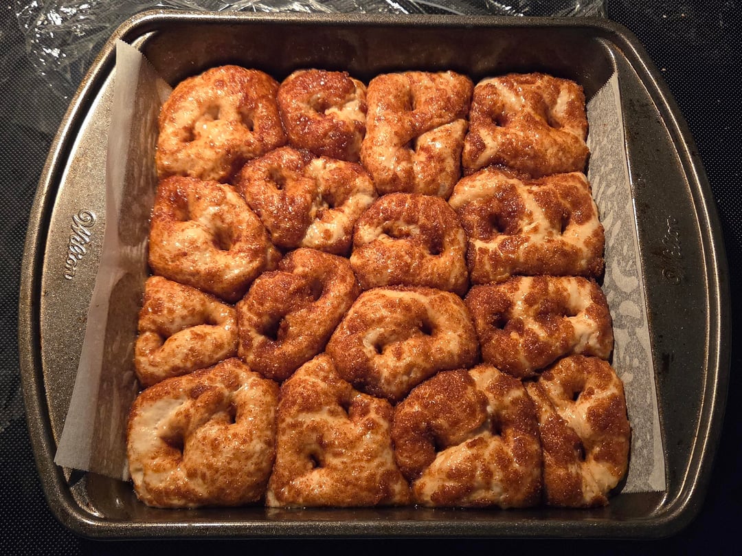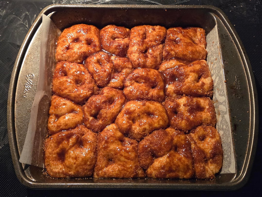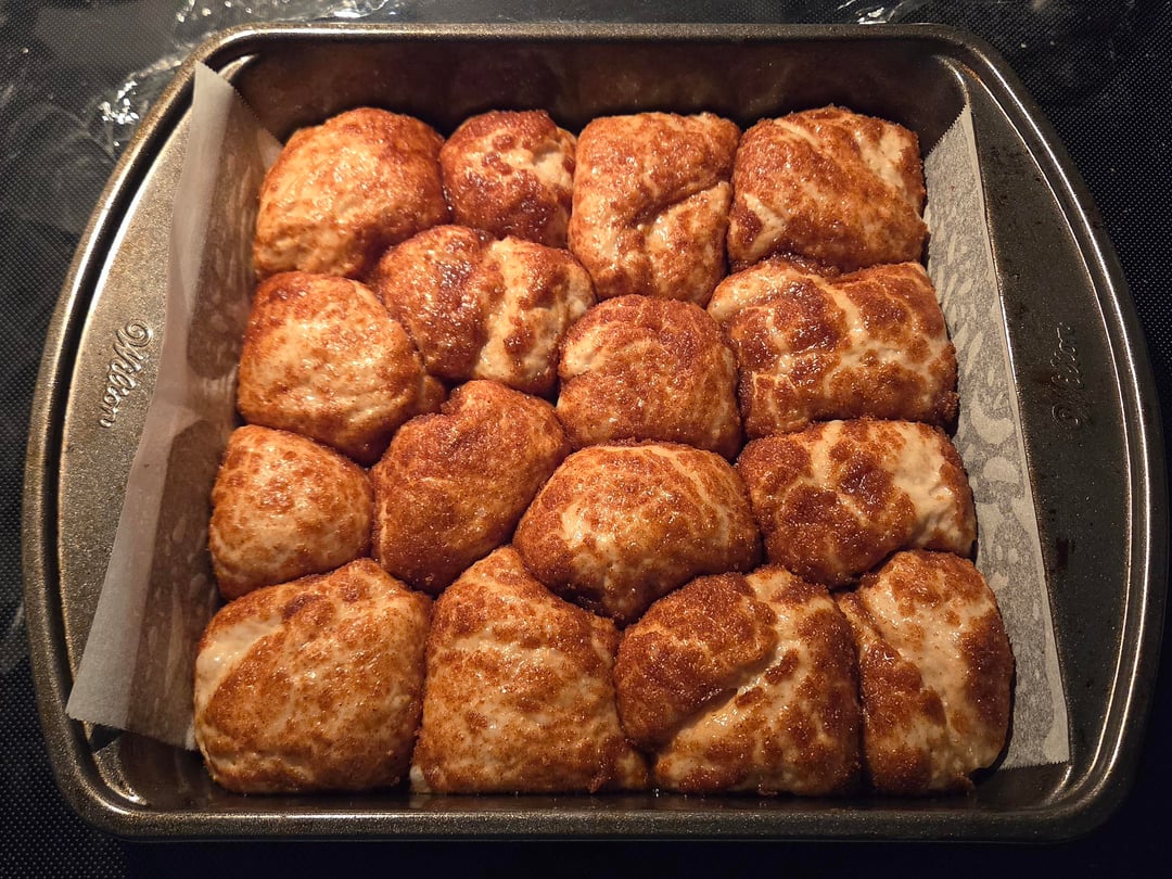 Brown the butter in a saucepan and add the vanilla extract. Take golf-ball sized chunks of dough and coat them in the butter, then dip in a mixture of white sugar/brown sugar/cinnamon. Place the chunks into a parchment-lined and greased 8×8 pan. Cover and let rest for 1 hour. Bake at 400°F (205°C) for 25 to 30 minutes.