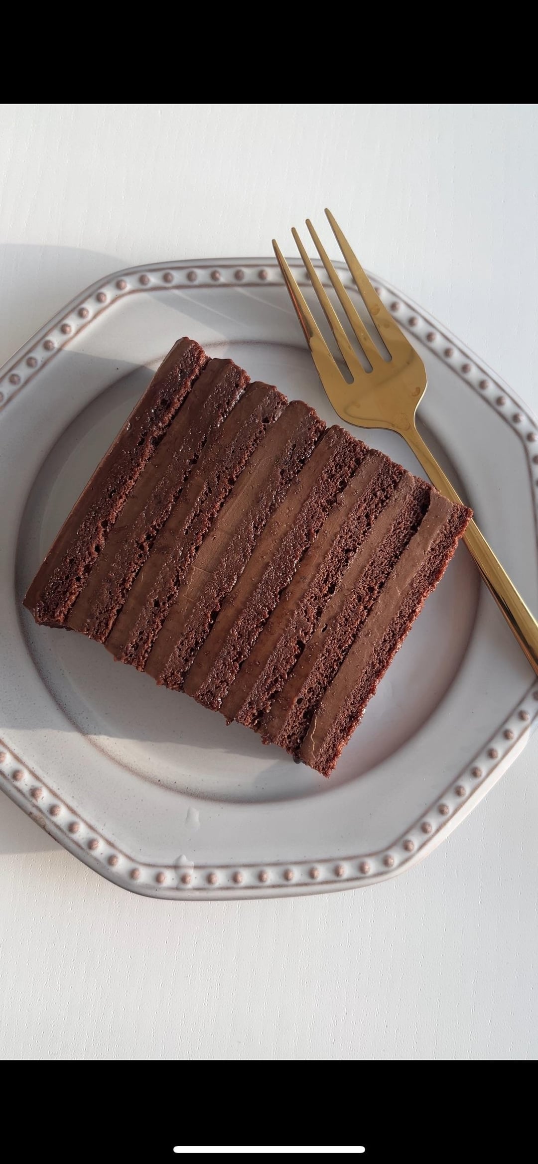Soft chocolate sponges, layered with silky chocolate cremeux, topped with a shiny cocoa glaze.