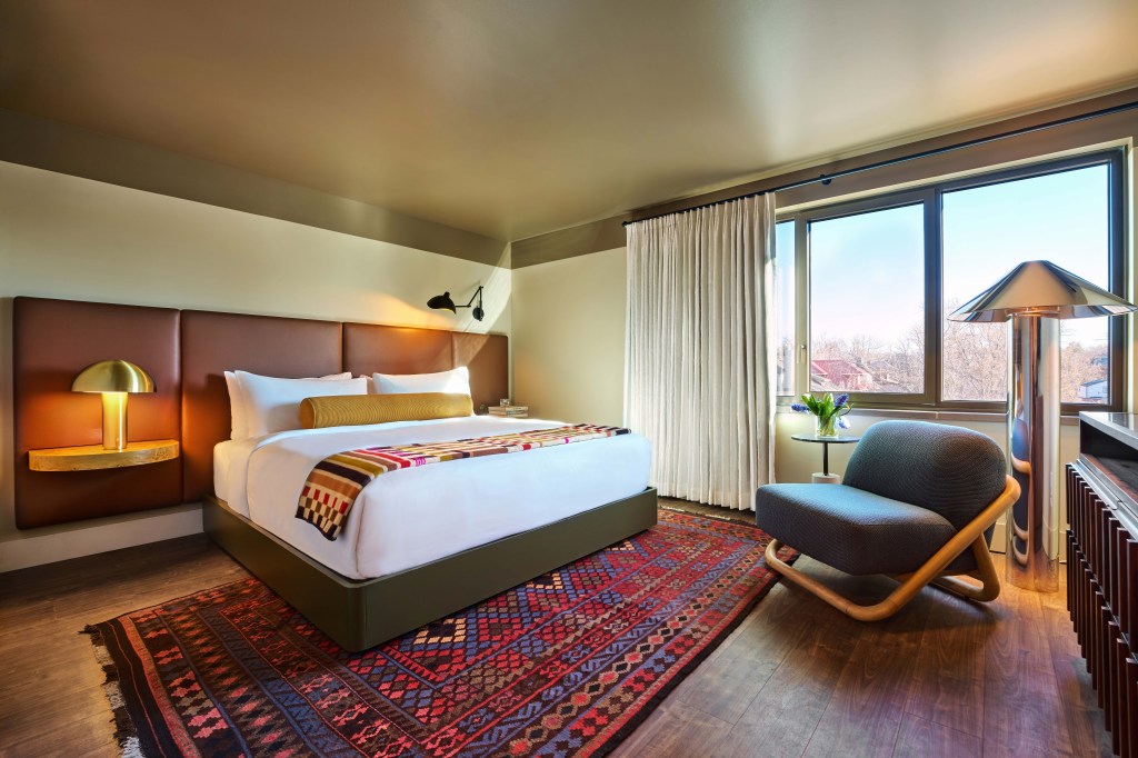 The hotel and restaurant were designed by Maximalist, a Denver-based interior design firm behind bar Sorry Gorgeous, Japanese restaurant Kumoya and Bar Amorina. There are three floors of guest rooms, each painted a different color and with custom-made lamps and furniture.
