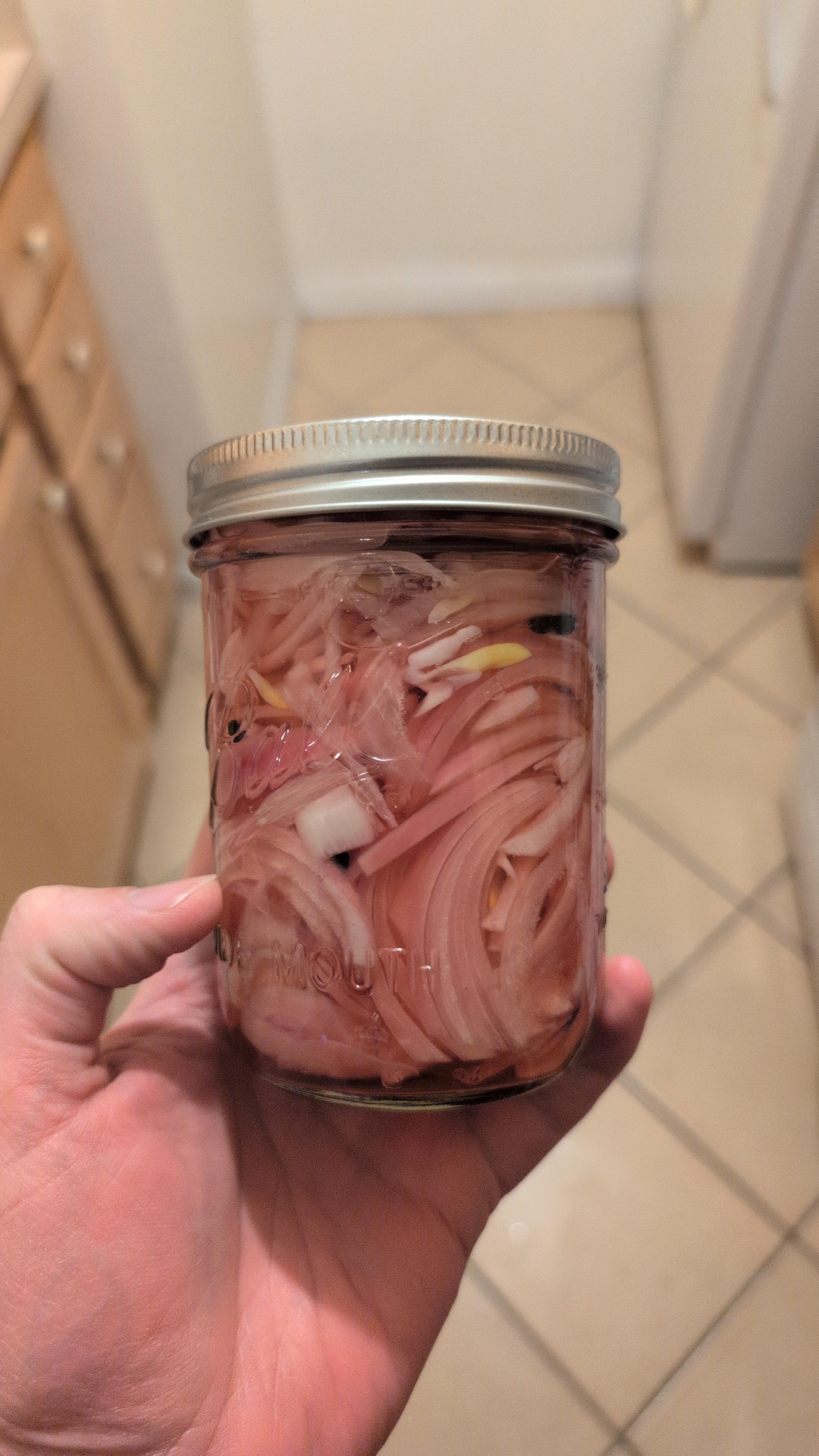 Bring the liquid to a boil and pour over the onions garlic and pepper!