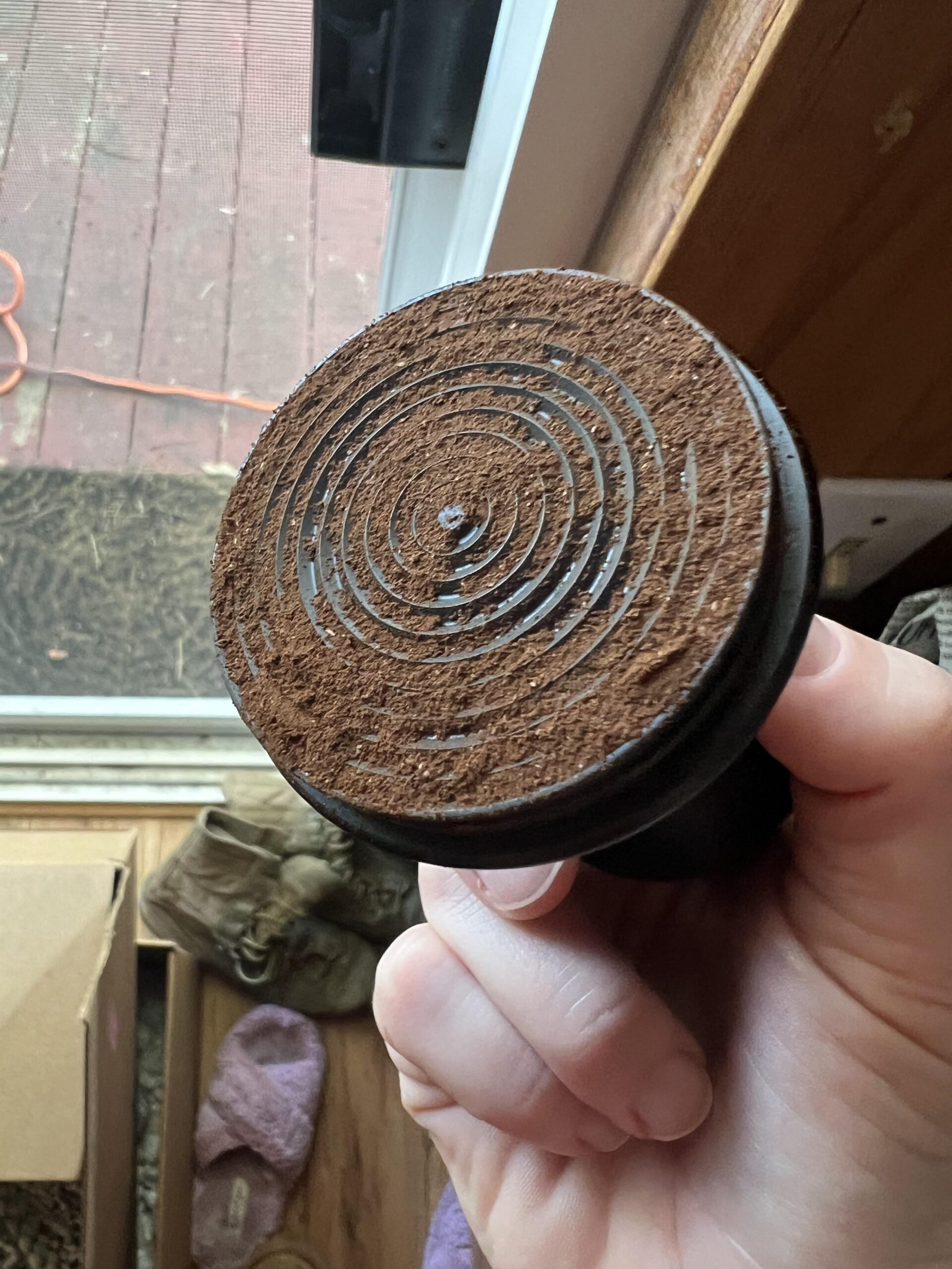 I looked at the tamped espresso and knew something was wrong, so I flipped over the tamper and saw this! I asked my fiancé what happened, and he said “I don’t know! The beans came out wet.”