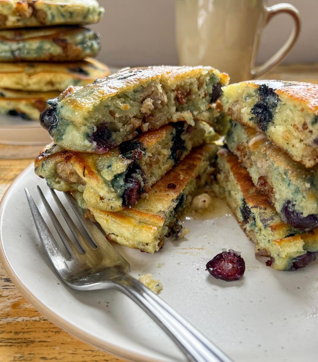These homemade pancakes were stuffed with maple sausage and juicy blueberries! I whipped up a maple butter to spoon over the top and served them in a big ole stack! They were incredible and super easy to make. Freezer friendly too😋🫐