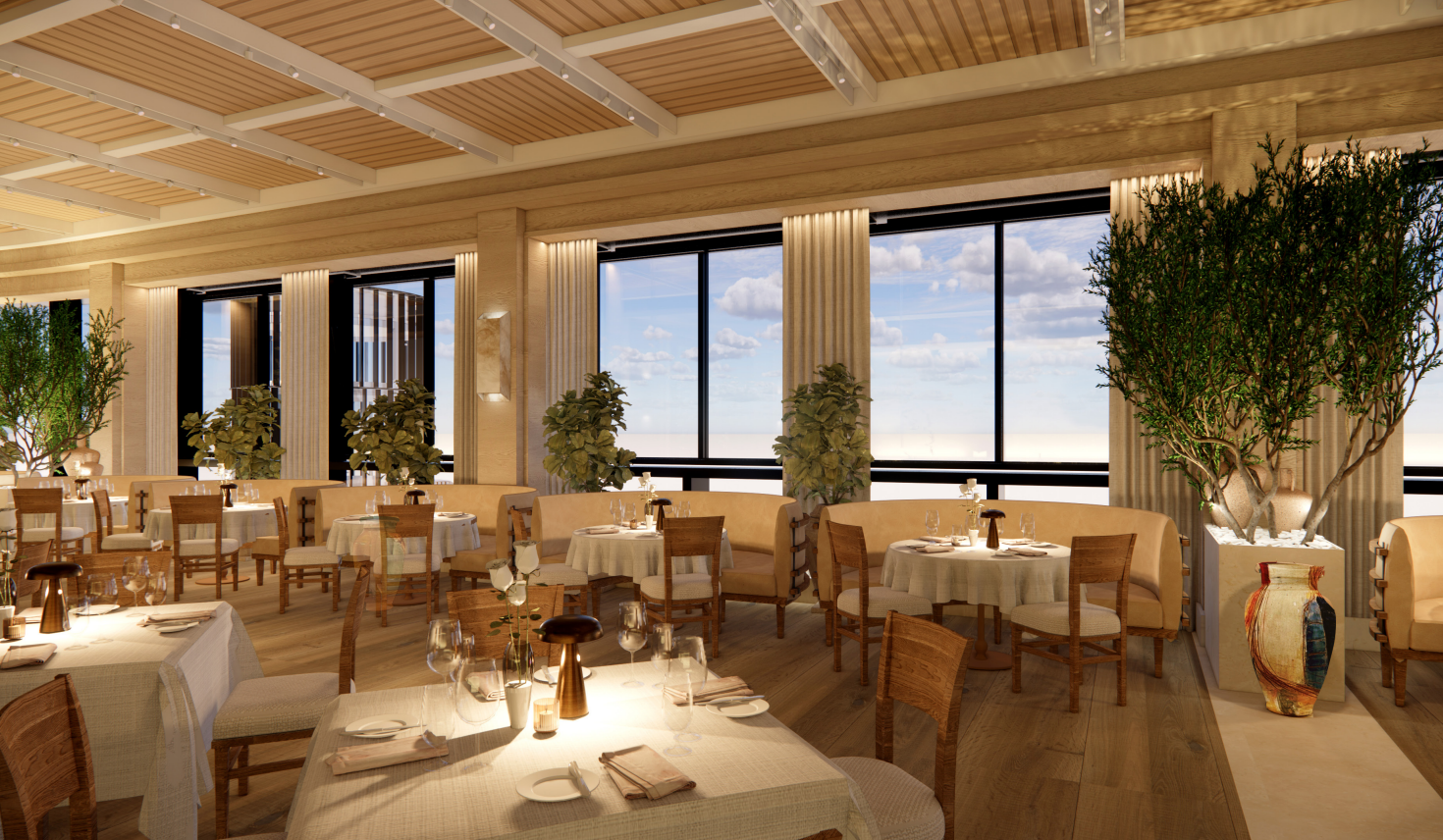 Designed by Rockwell Group, the 250-seat restaurant channels the look and feel of the Greek islands, with bright, coastal interiors, sculptural olive trees and a striking salt wall installation made of crystallized panels. Floor-to-ceiling windows flood the dining room with natural light, while an indoor-outdoor setup allows for alfresco-style dining when the weather cooperates.