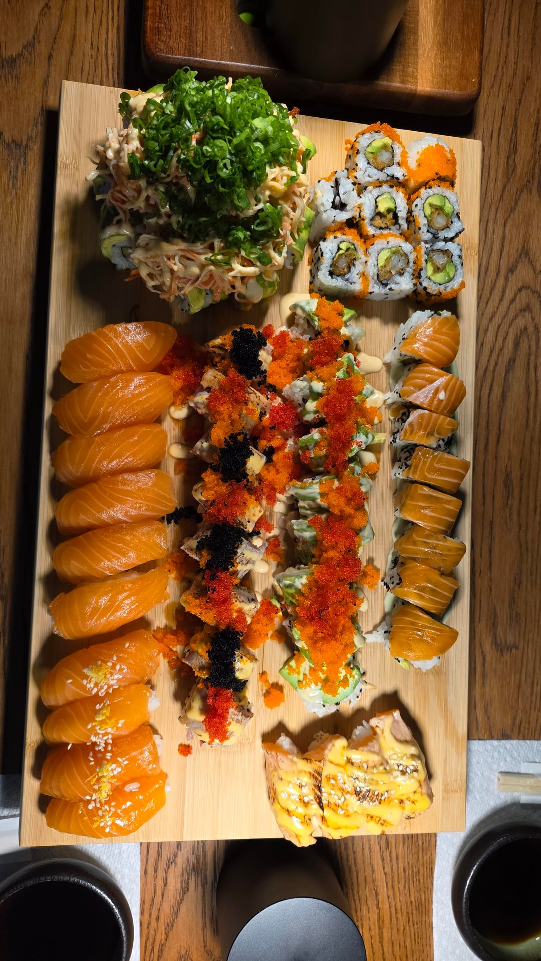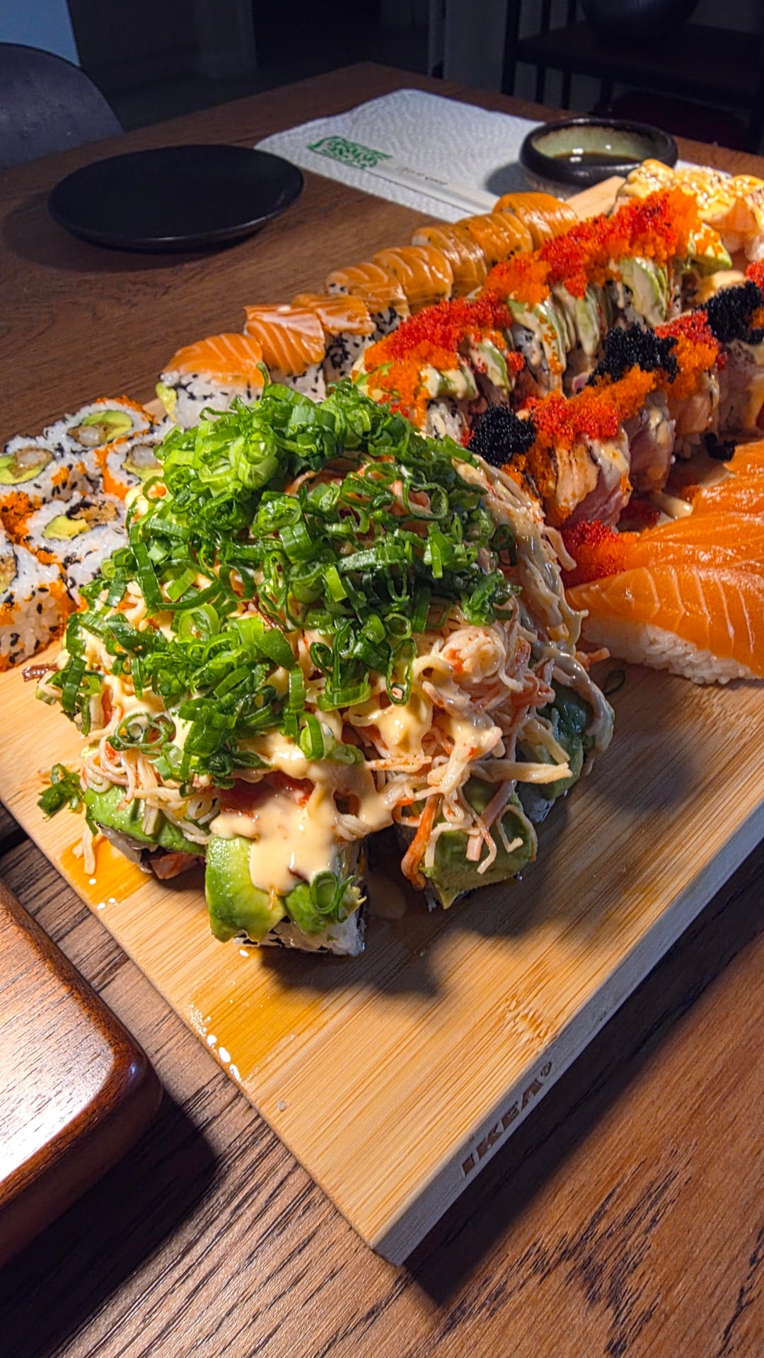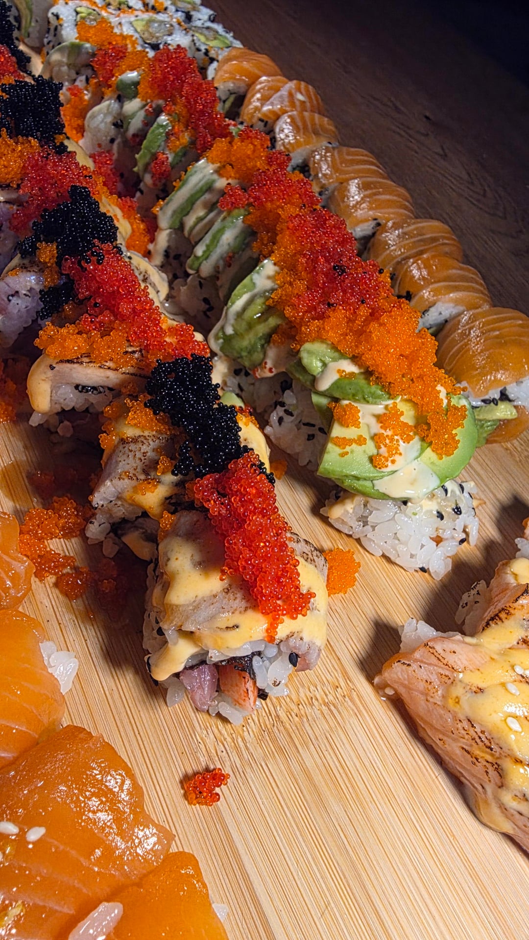My favorite roll is the one with black and red tobiko alternating, it has yellow tail, tuna and salmon on top thats drizzled with unagi, spicy mayo and alittle yum yum then torched. Inside i usually put tuna, salmon and krab.