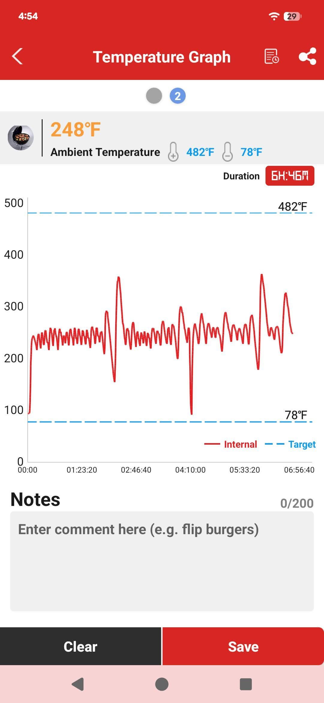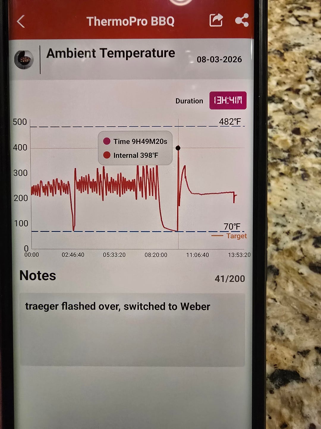 Attached are some ambient thermometer readings that clearly fluctuate wildly I believe for the first one I had it set for a chuck roast at 225f and I know that it will keep within about a 50° region typically but sometimes it we'll just Leroy Jenkins up to 400+…