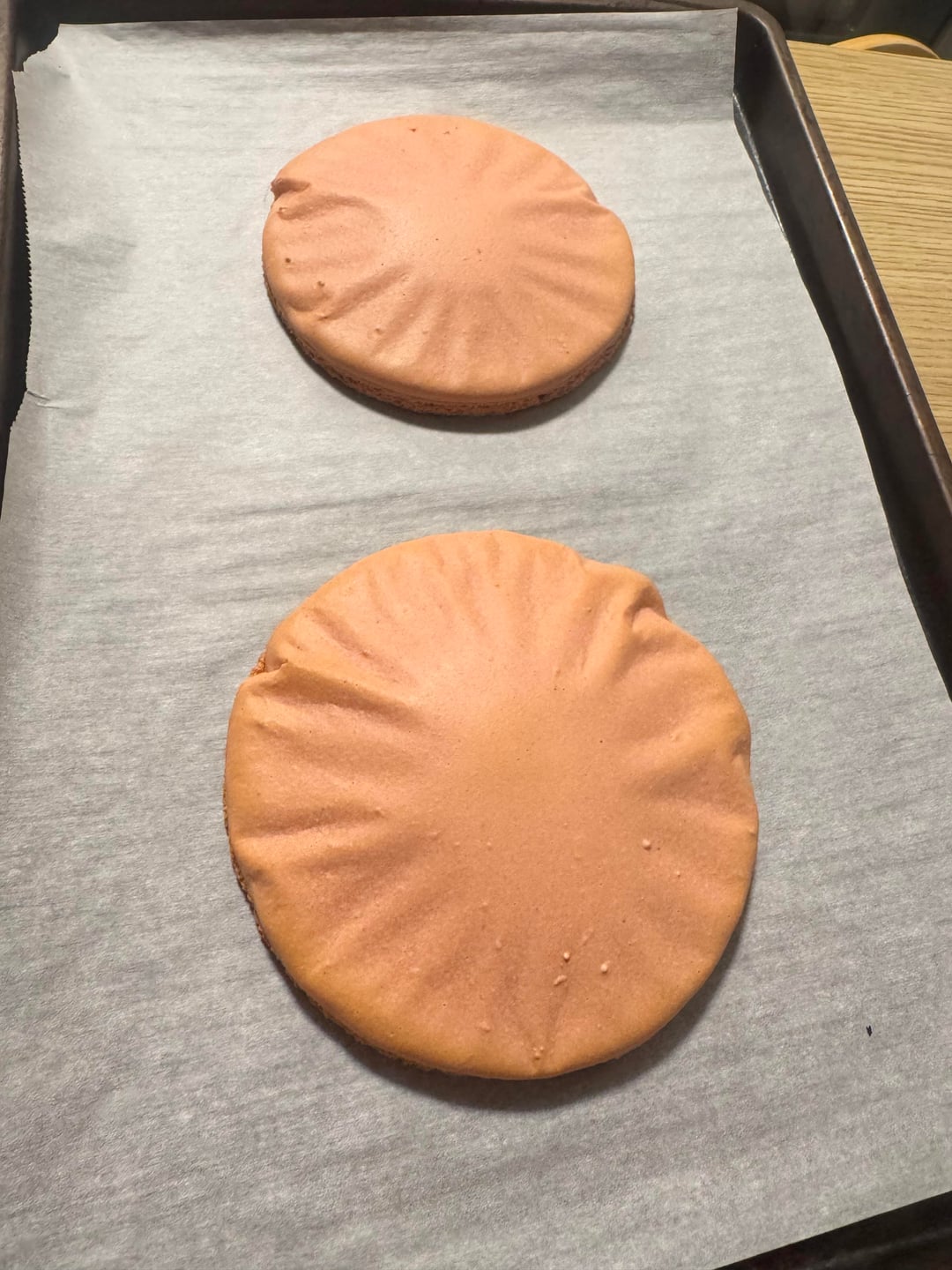Hi friends! I am attempting to make the pies and tacos recipe for strawberry macarons but in her “cake” style. Which means 5 inch macaron shells. I made the recipe before in the regular size and it worked well. But when trying the bigger size I noticed my shells raised evenly for a while and eventually while in the oven it seems the middle got taller and the edges sort of wrinkle / cave in. The one thing I changed on this attempt is that I added some gel food coloring and the sizing of course. Any idead on what could’ve caused this?