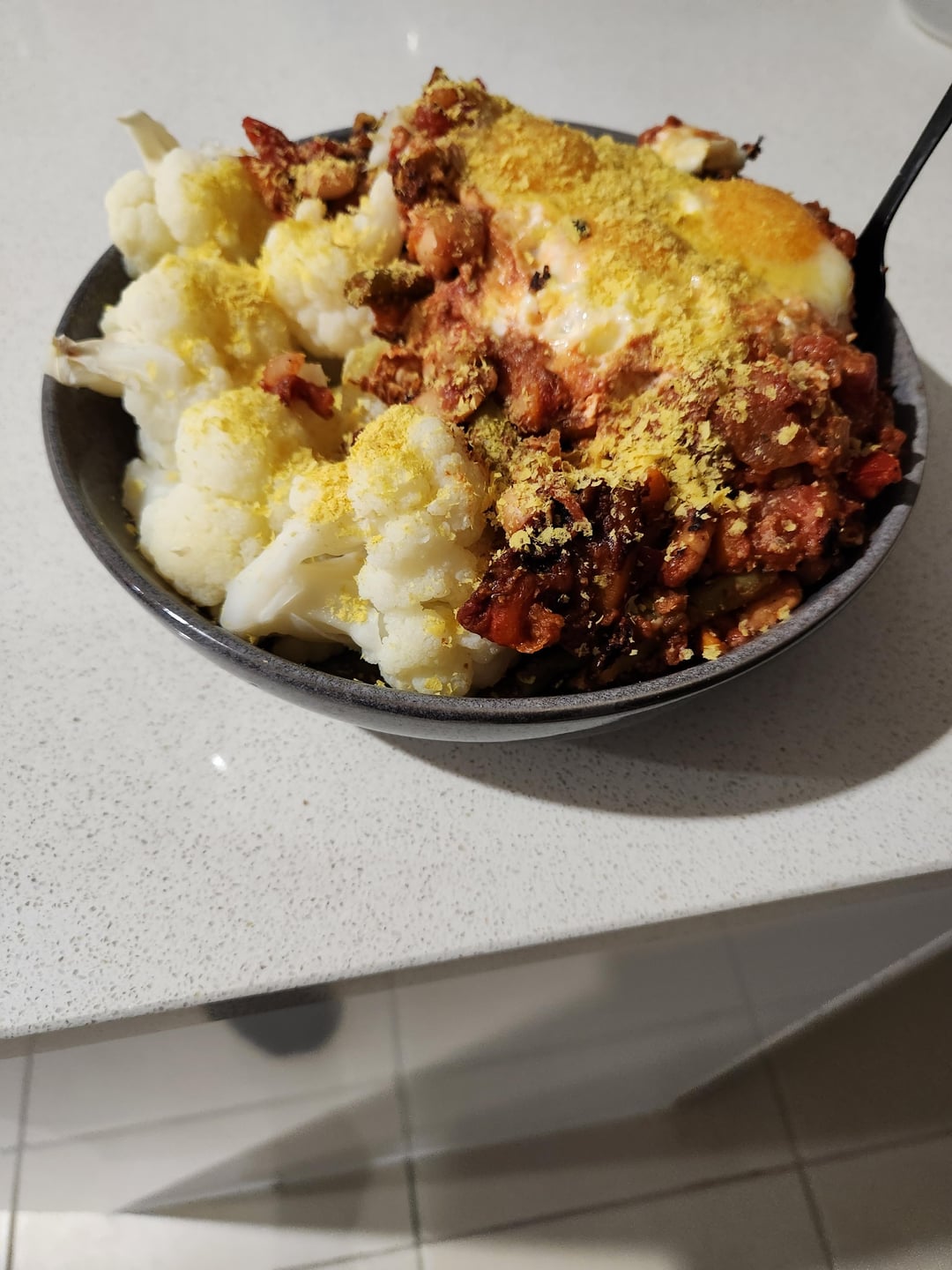 Meal 2: white bean shakshuka (cannellini beans half 400 g can drained, 400 g tin tomatoes, 250 g mixed frozen veges that included onion and capsicum, garlic, paprika) with steamed sweet potato and steamed cauliflower. This was insanely filling with extra carbs as it was after a long run. Total calories 807, P 46, F 18, C 114.