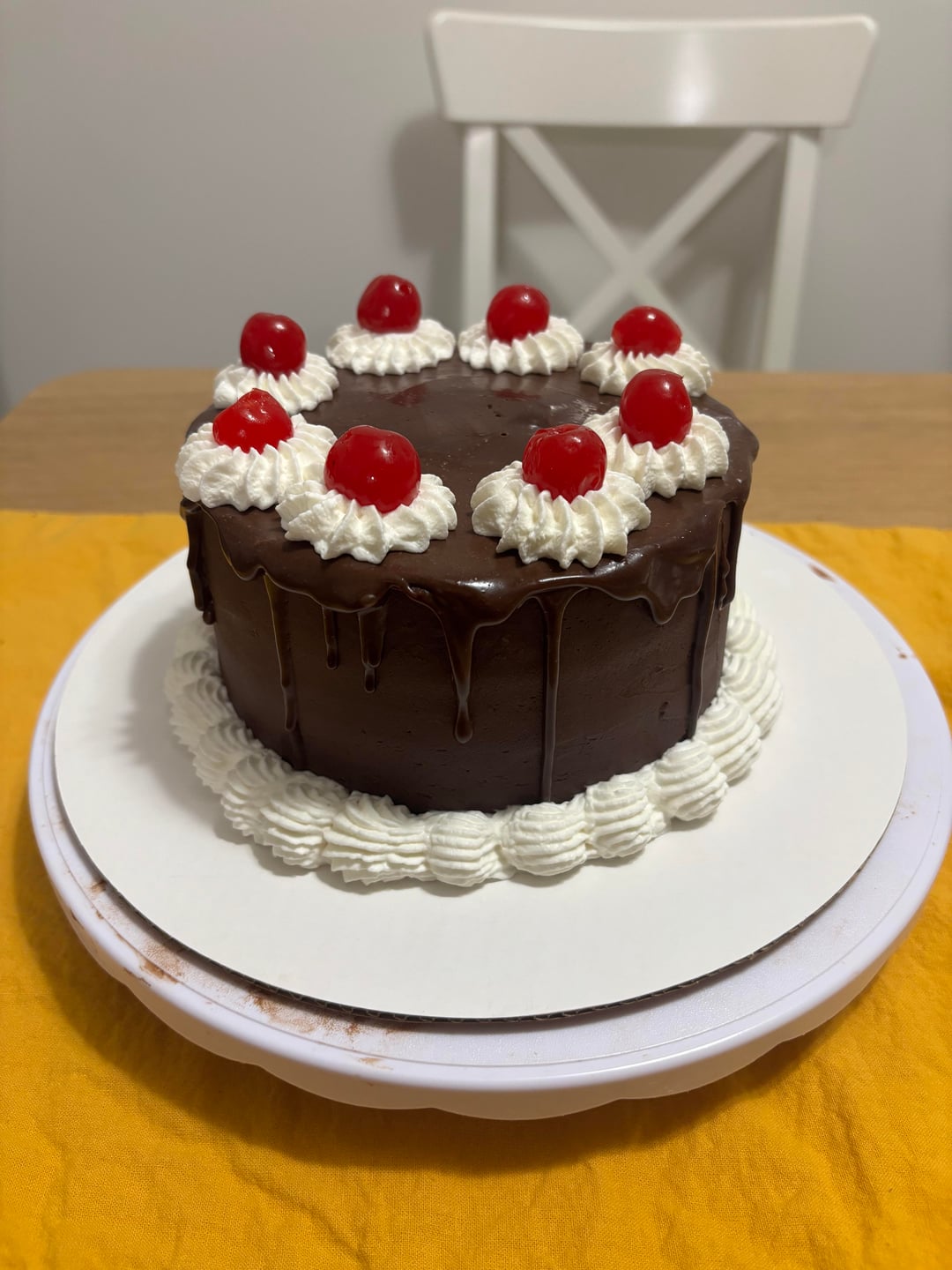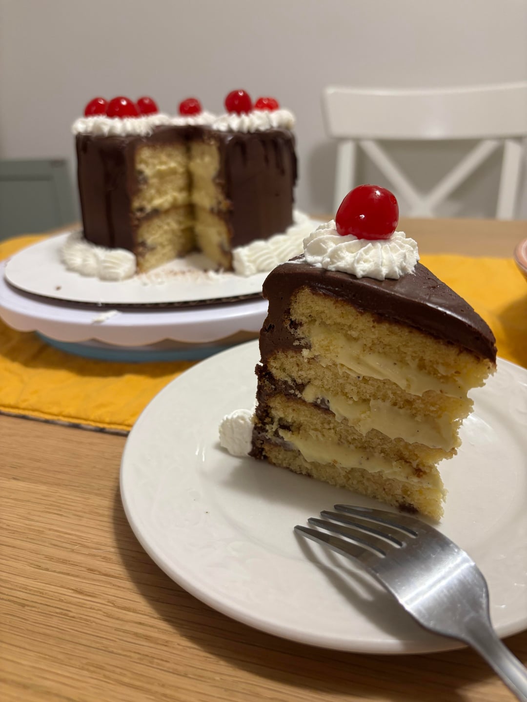 Cake recipe is the yellow chocolate cake from the broma bakery cookbook sweet tooth. Frosted with ganache and filled with pastry cream that are both just typical ratios/recipes I found online. With some whipped cream cuz I screwed up the bottom of the frosting when I moved it onto a bigger cake round. When I was a kid, my mom would always get us the ones from stop and shop that had a maraschino cherry in the middle and me and my siblings always wanted to be the one to get the cherry. So since it’s my cake I decided to put a cherry on every piece