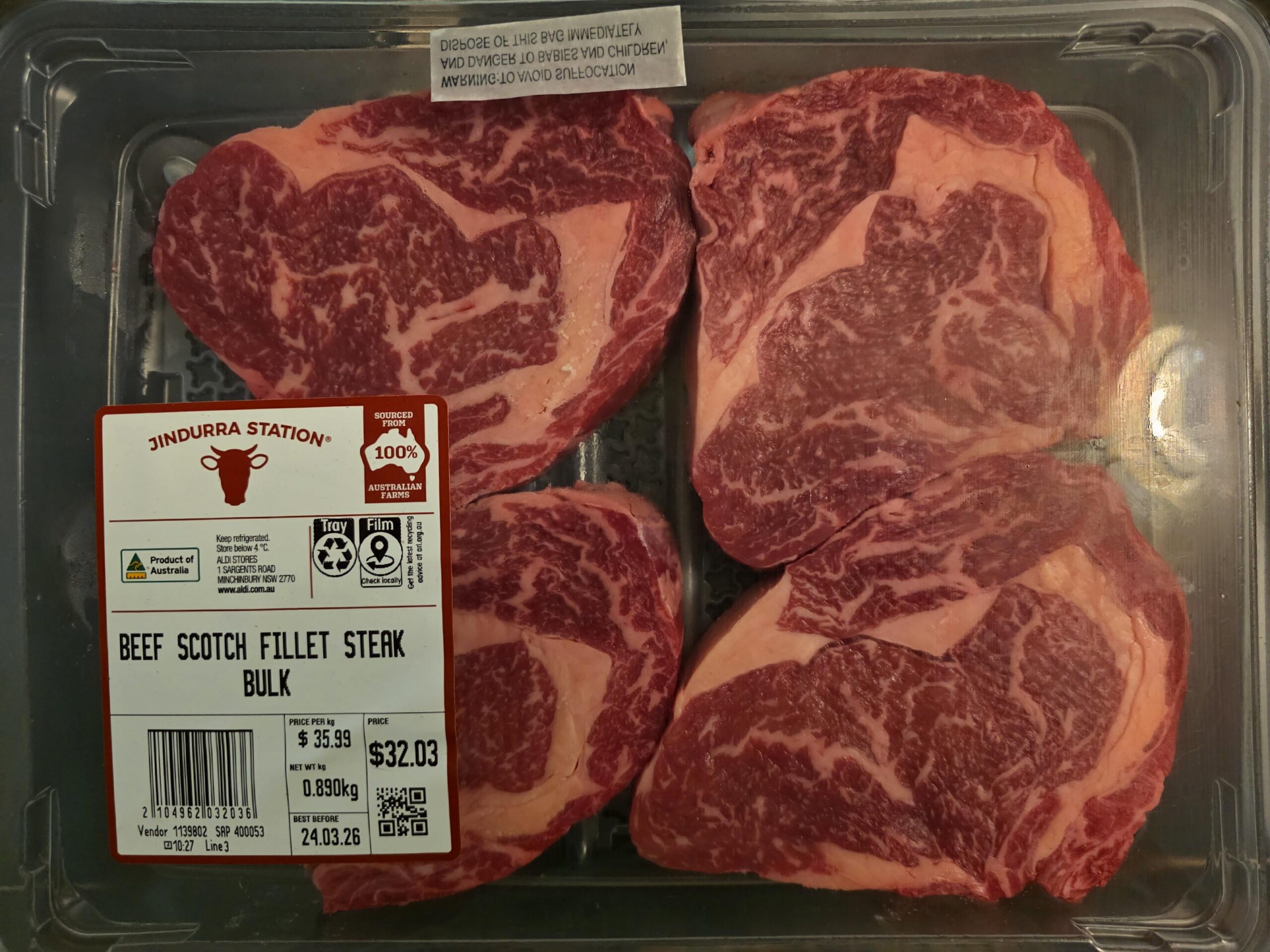 Definitely a lot more "marbling" then scotch fillet I'm used too. But its from Aldi 😬