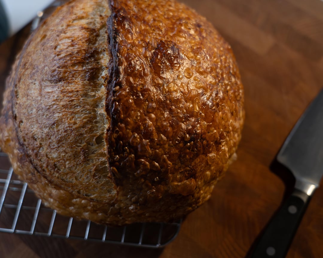 Mix 450g bread flour, 50g whole wheat flour, and 400g water until combined and let autolyse for 2-3 hours. Add 100g starter and 10g salt using a stand mixer and mix medium-high speed until smooth. Let the dough bulk ferment, doing a few coil folds early on, until its airy and jiggly. Preshape and bench rest for 30min, shape it, place into a banneton, and refrigerate for about 2 days. Bake in a preheated Dutch oven at 450°F covered for 25 minutes with ice, then uncover and finish at 380–420°F for another ~30 minutes until well browned. Cool before cutting.