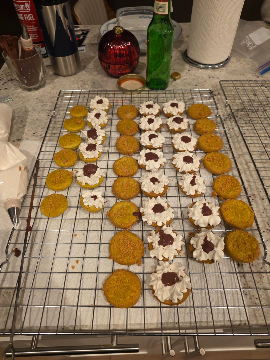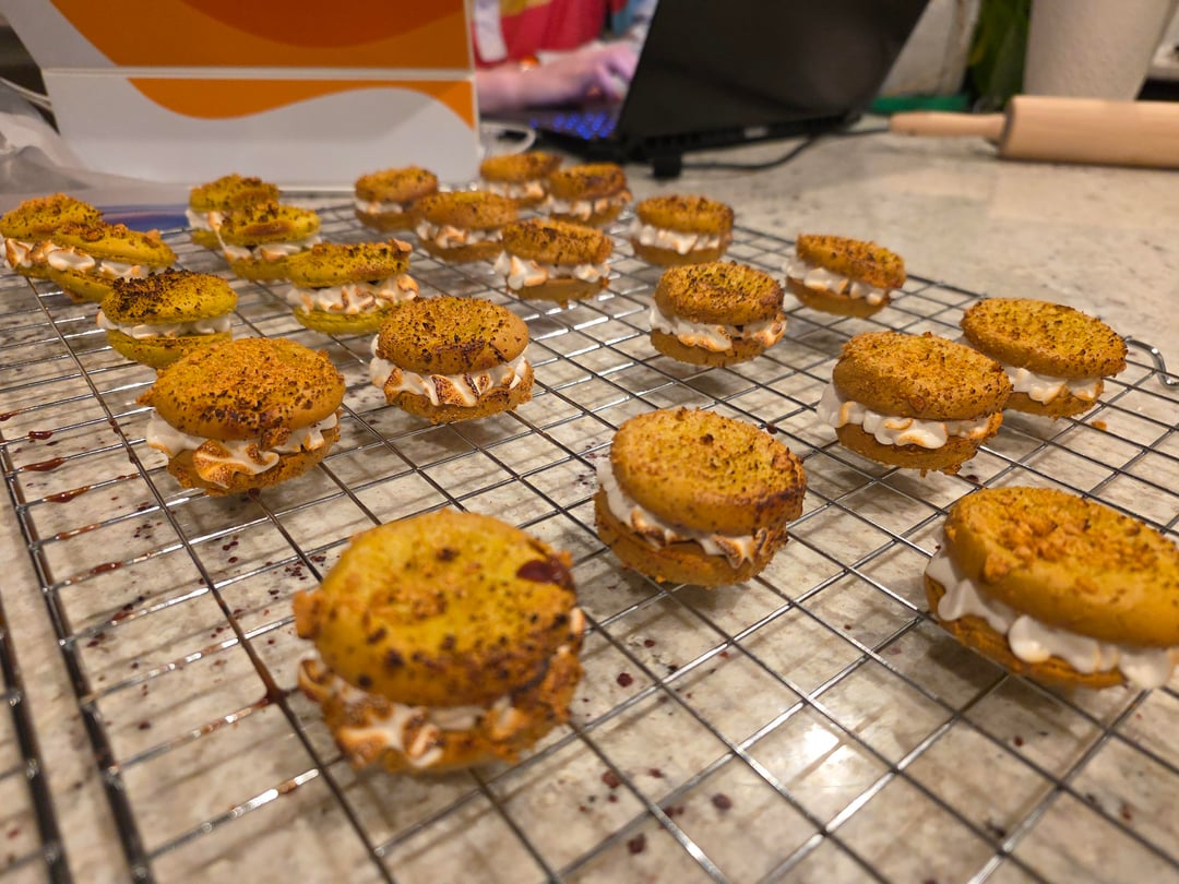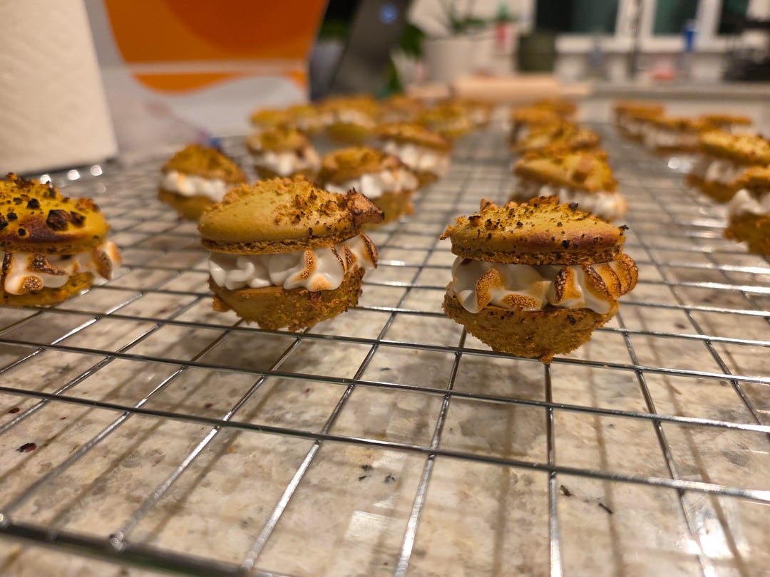 The filling is a milk chocolate ganache surrounded by marshmallow fluff that I toasted with a blowtorch. The shells have crumbled graham cracker sprinkled on.
