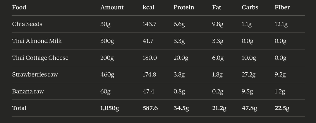 Chia Pudding – 600kcal, 1kg food, 30g protein, 22g fiber