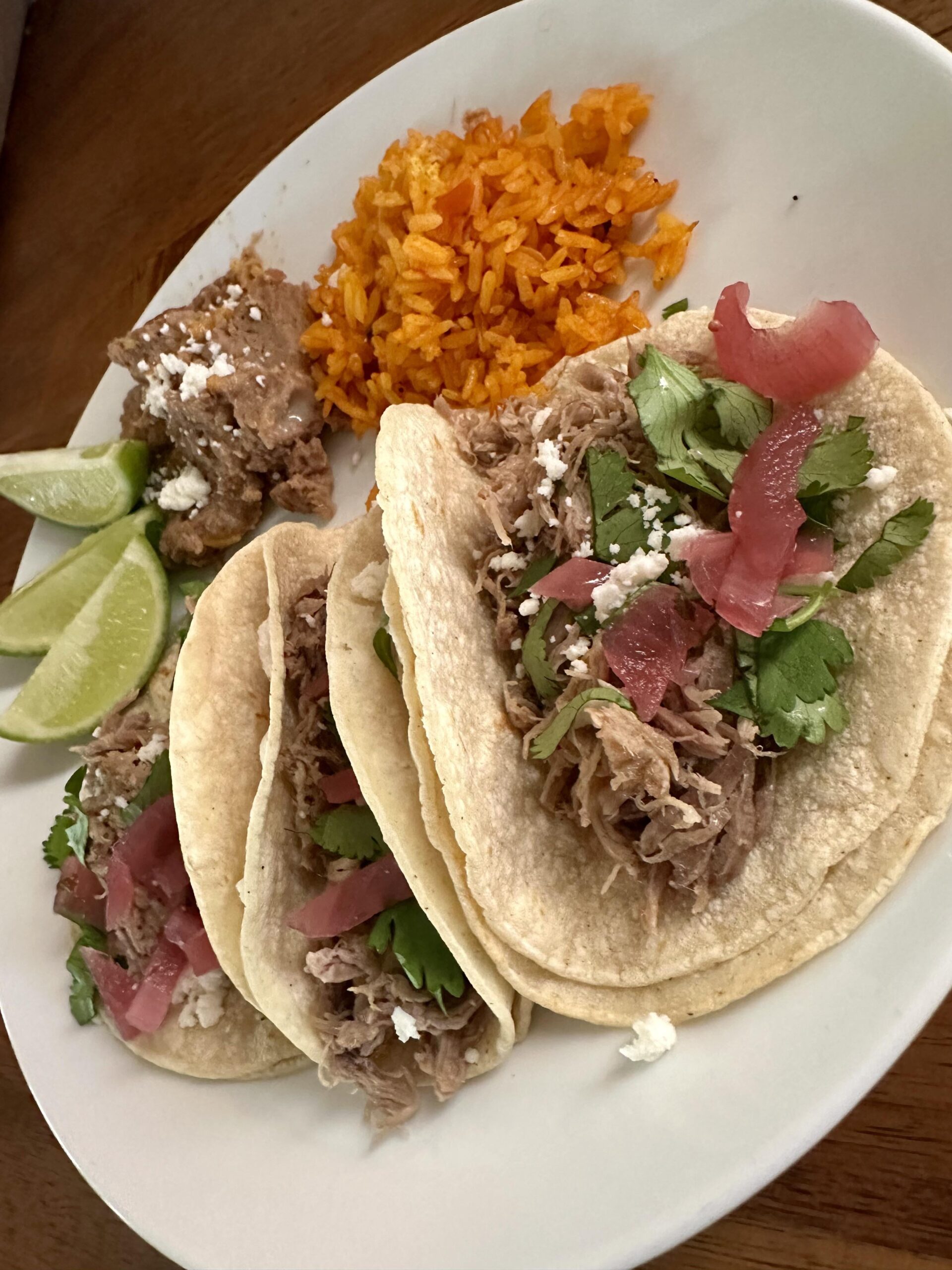 Pickled red onions, cilantro, cotija, refried beans and rice with lime wedges.by dentalexaminer Dining and Cooking
