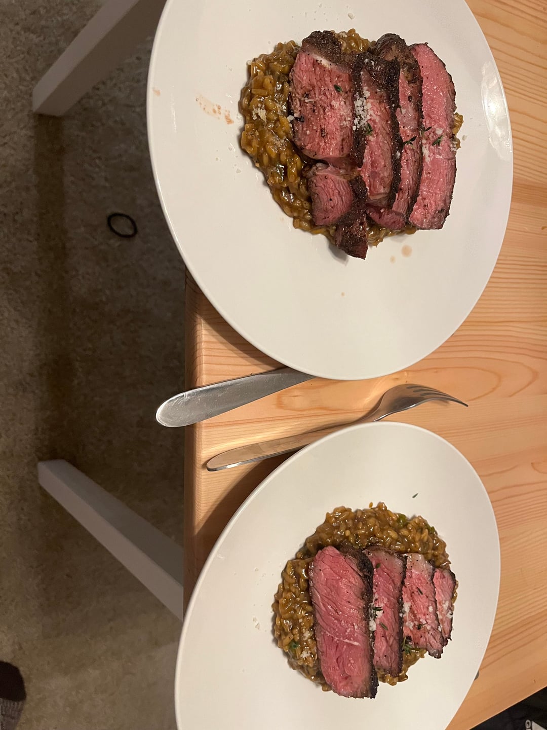 lol risotto? I thought it was baked beans and I was about to criticize laying such a beautiful steak on a bed of beans. That crust looks fantastic!