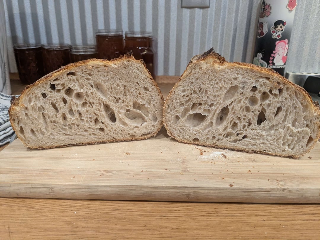 Knead in mixer for 8-12 minutes on medium low. Bulk ferment in the mixer bowl and give a few folds for the first few hours. Didn't need many folds, already lots of dough strength. Bulk ferment until doubled and marshmallow-ey which took about TEN hours (yes it's way longer but that's just how long it takes me). split into two, shape, get into bannetons, let rise for another hour-ish. Fridge. This dough has been in for about 40 hours I'd say. Cold dough on parchment, score, into preheated dutch oven (450), turn oven down (425), 20 min, lid off, 20 min.