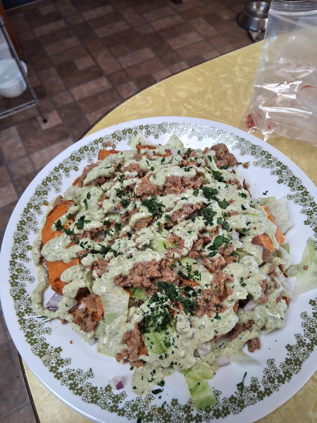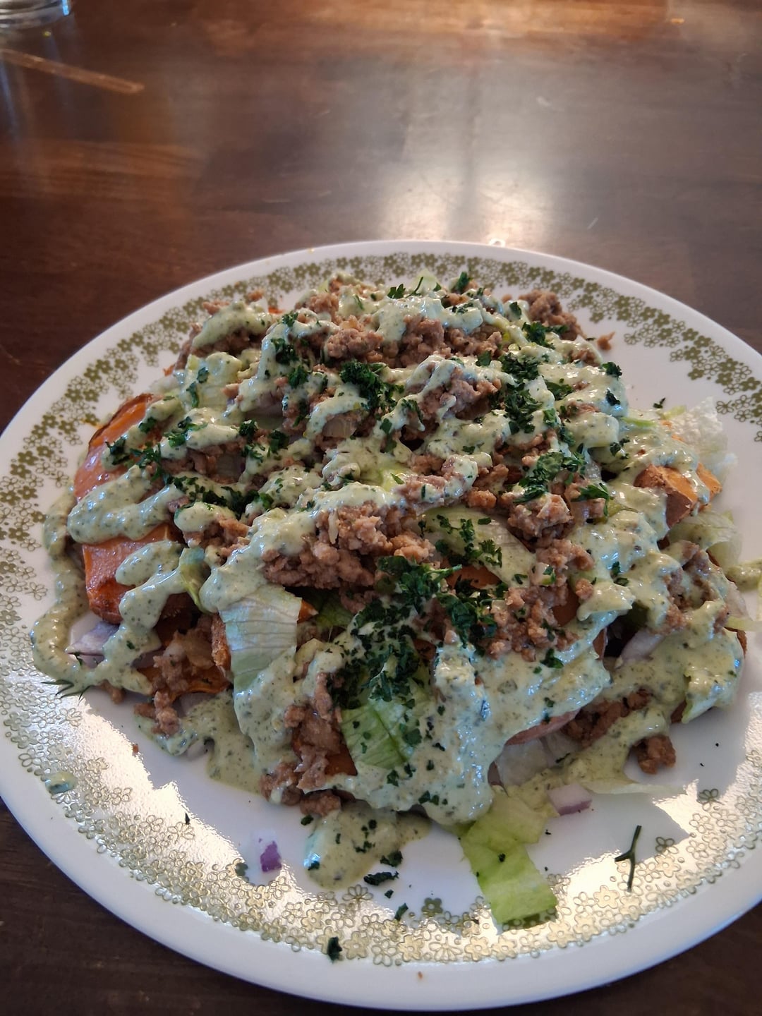 This was sooo good and filling 530 calories! Sweet potato Ground turkey Nachos veggies Homemade green sauce (non fat greek yogurt, cilantro, jalapenos, and ranch packet )by Expensive-Flower3140 Dining and Cooking
