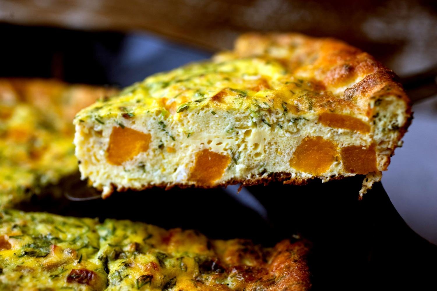 Greeks often add yogurt to their omelets, which contributes calcium, protein and bacteria long believed to help digestion. Yogurt also gives the omelet a light, fluffy texture. Make this with winter squash in winter and with zucchini in summer.
