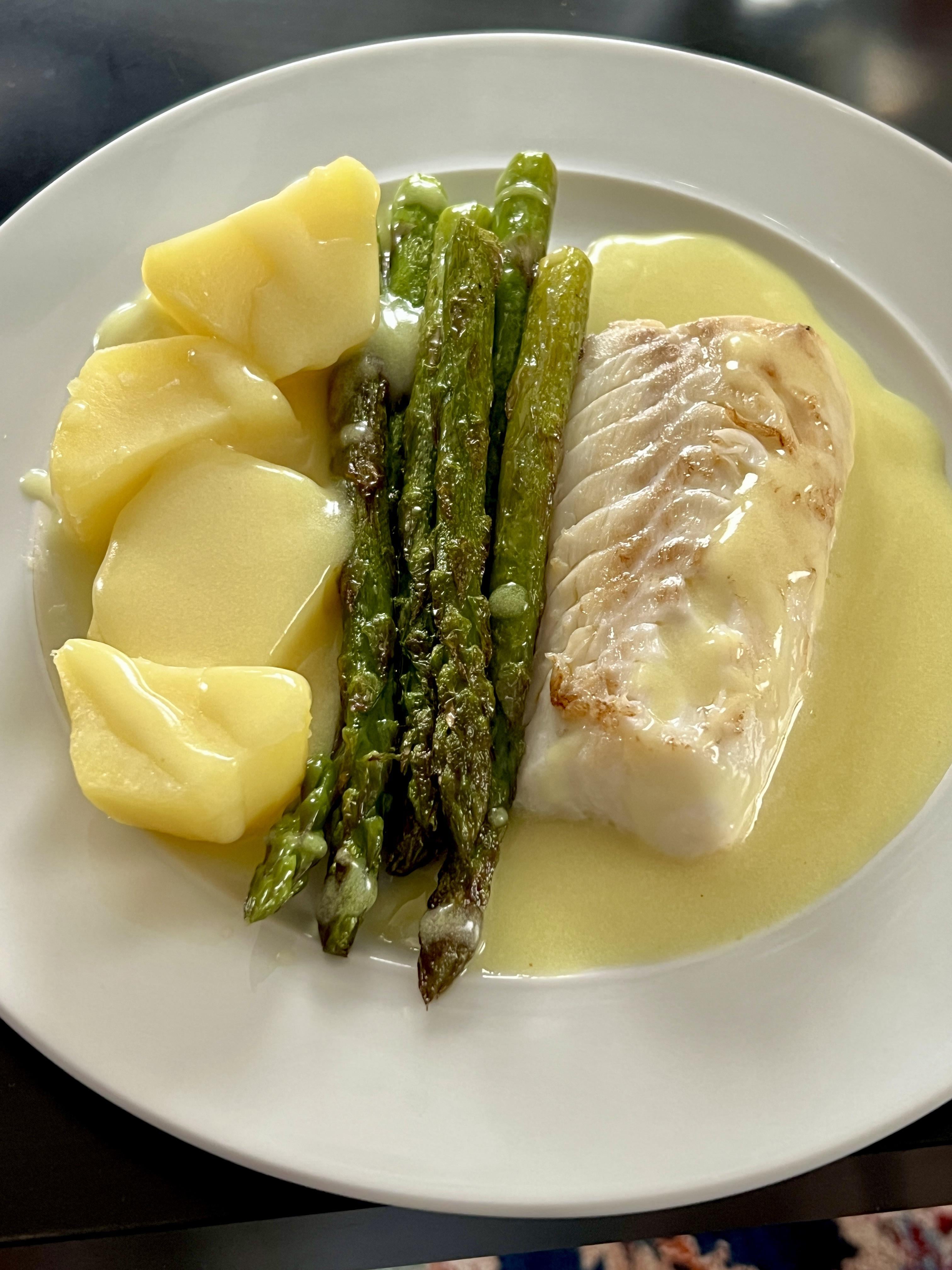with fried green asparagus, potatos and sauceby hansebart 1 Comment Subject_Slice_7797 3 weeks ago Nice slab of fish! With lemon butter sauce?