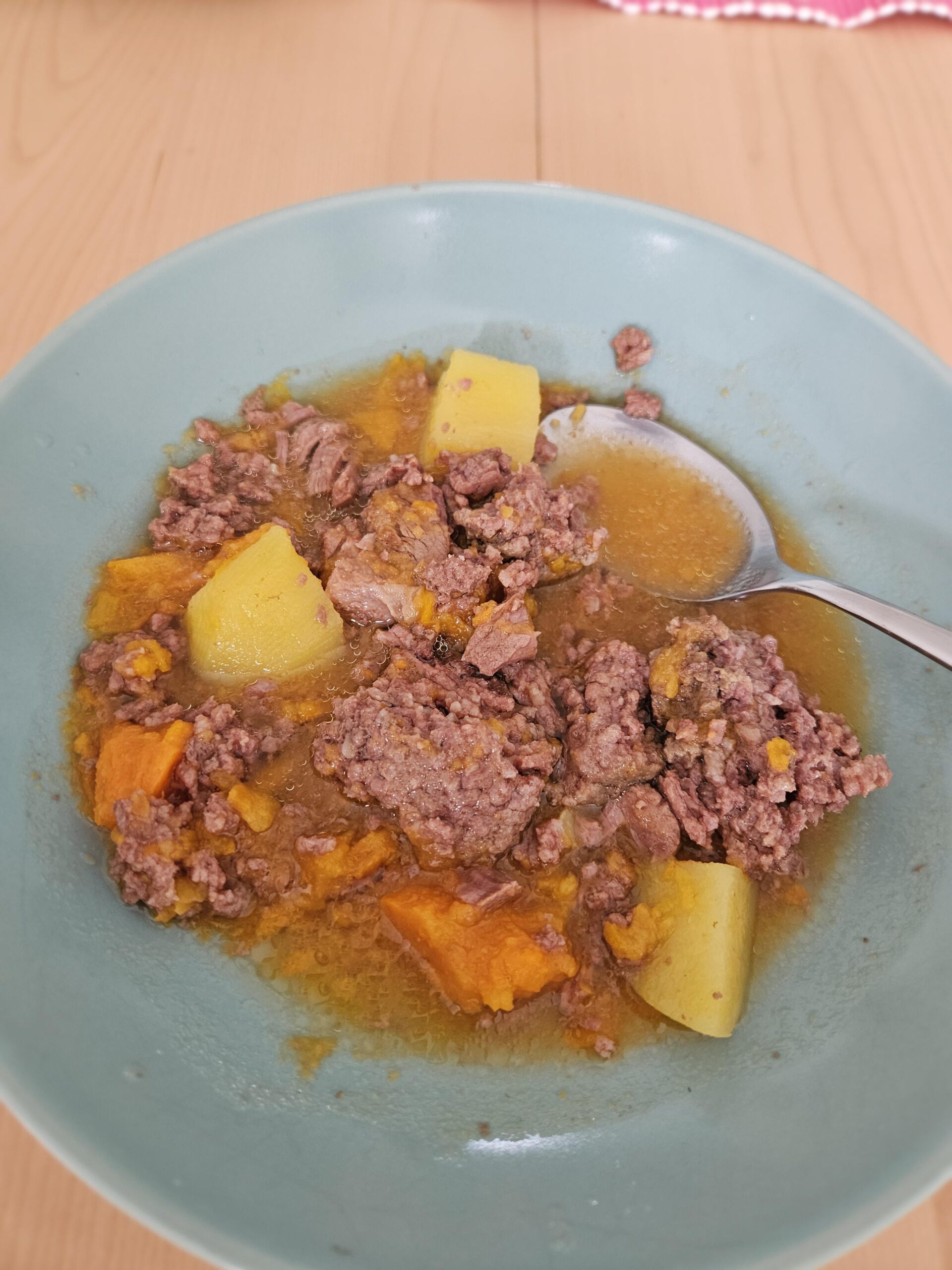 ground beef, sweet potatoes and russet/yellow potatoes, all in some sort of beef stock stew? Sounds like a mushy mess, but plenty of protein!