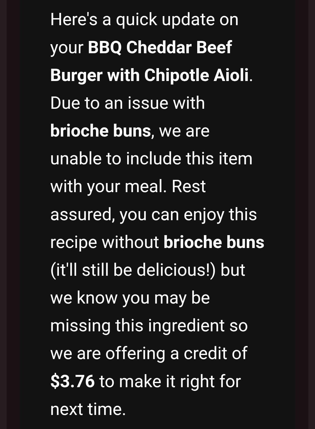 Guess I'm buying buns π but at least this made me laugh in spite of the annoyanceby mom_to_the_fuzzies 3 Comments toadaly_rad 3 days ago Usually they would swap it for some other kind of bun? diaymujer 3 days ago Wait, they donβt even swap it for different buns? They just said βenjoy your bunless burgerβ? Firstsassythensweet 3 days ago Now go argue in the chat and request a free box thatβs ridiculous