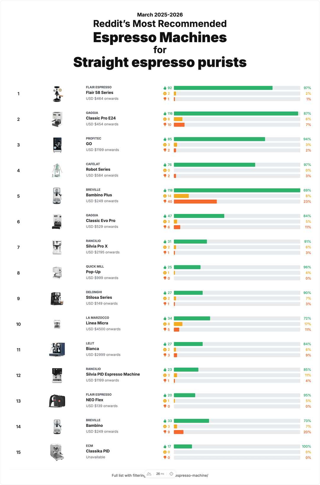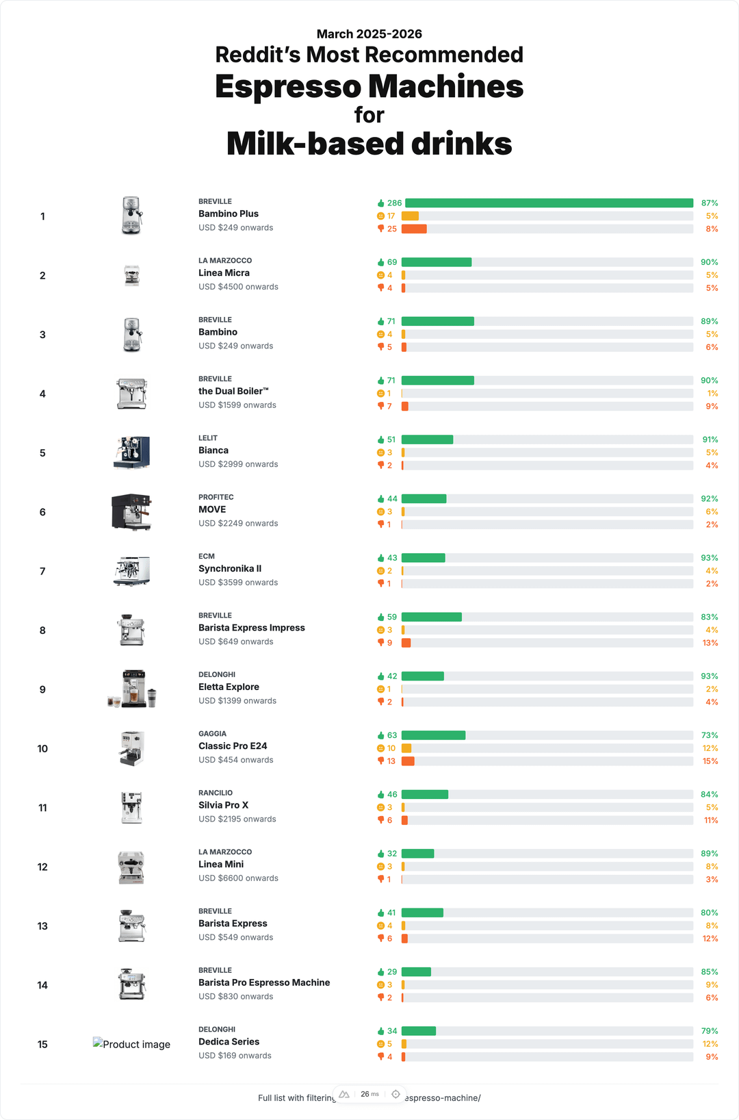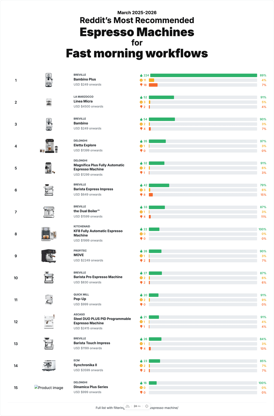 Was doing some analysis on Reddit data and looked into espresso machines. Thought I’d share the results.